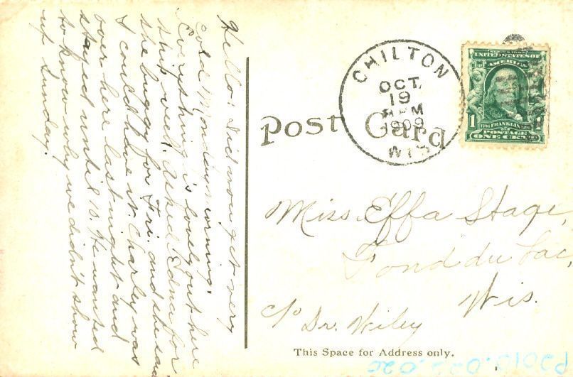 Written in black ink on the back addressed to "Miss Effa Stage, Fond du Lac, Wis. c/o Dr. Wiley". "Hello: Did you get very cold Monday morning. Everything is lovely out here this week. Asked Edna for she buggy for Fri. and she said I could have it. Charley was over here last night and stayed until 10. He wanted to know why we didn't show up Sunday." There is a Franklin 1 cent stamp and a post office stamped marked Chilton, Wis. Oct. 19 1909Collection
