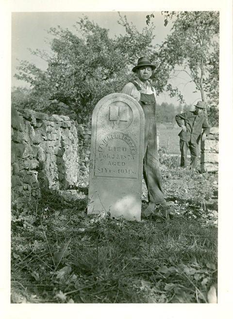 Written in black ink on the back of BC2010.022.058A "Herman Niles at the grave of his great grandmother. She was the mother of David Fowler,-- and last David. Patience Dick married James Fowler and John Seketer came to Wis. in 1834 as a widow with 10 children" and in a different ink on the bottom "OCt 2, 1934- O.E. Heller".