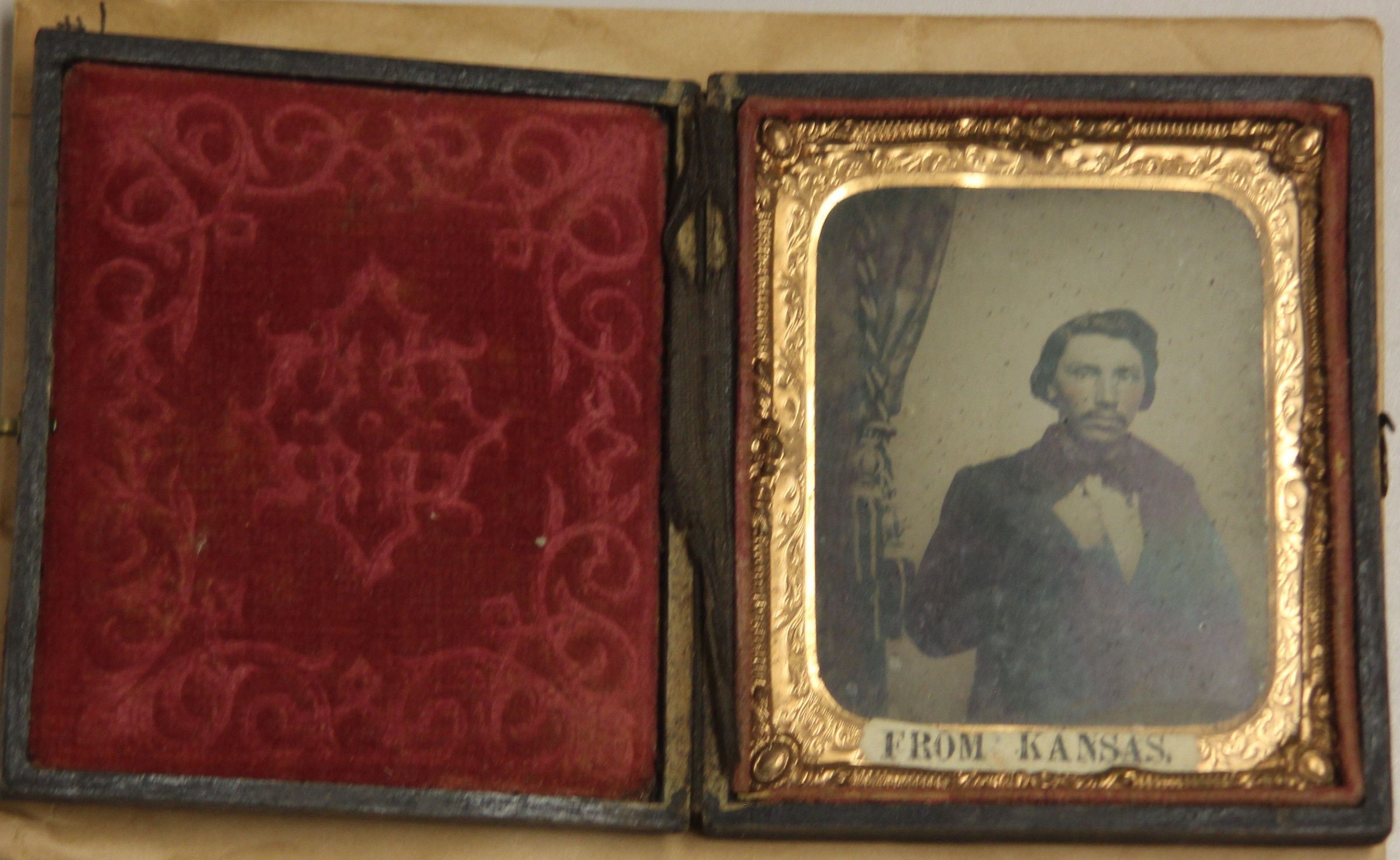 Tintype of a man standing next to a curtain (to his right, left in image). His hand is clasping his lapel near his shoulder. H e has a mustache and it looks as if the tintype was colored around his cheeks which look rosy. The tintype is framed with a cold decorative metal and "From Kansas" over the metal. The tintype is in a wood, latched book and there is a piece of red velvet with decorations opposite the image. The book has a floral design in the center bordered by a circle, branch looking flourishes, and finally a lined border. The front and back covers have the same design. The book came in an envelope with "Orlando D. Dick, #44" written on it. This is most likely O.E. Heller's organization system.