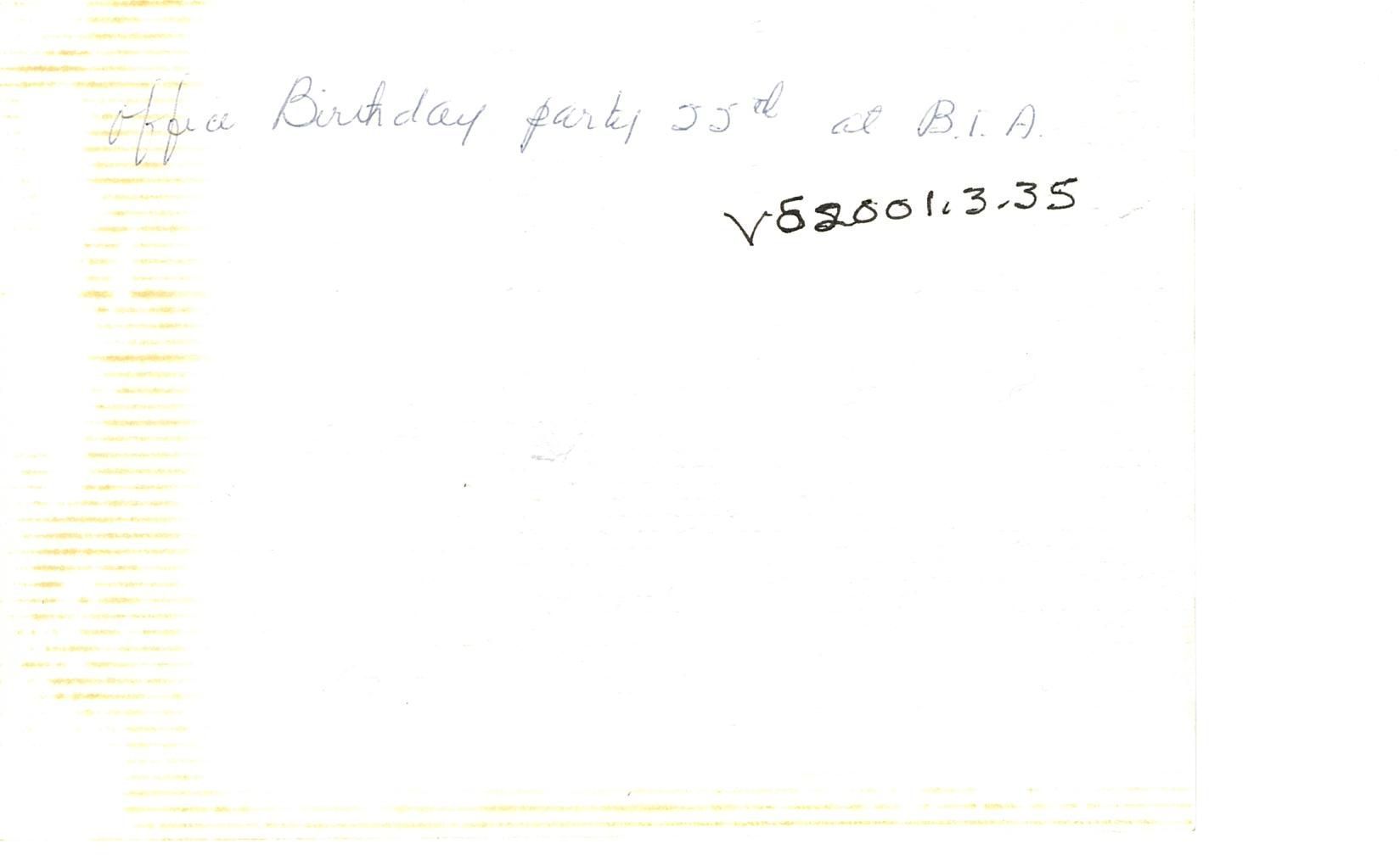 Black and white photograph of five men in an office sitting at a table and on a couch. There is a carafe of coffee and Styrofoam cups on the table along with some food. All the men are wearing suits and ties and a framed map is hanging on the wall in the back. Written on the back in ink "Office Birthday party 55th at B.I.A."Collection