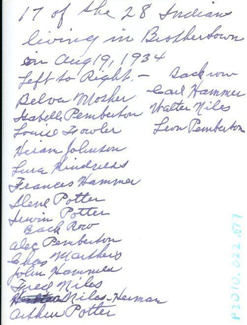 "17 of the 28 Indians living in Brothertown in Aug 19, 1934. Left to right-Back row Belva Mosher, Carl Hammer, Isabelle Pemberton, Walter Niles, Louise Fowler, Leon Pemberton, Heiam Johnson, Ilene Potter, Irwin Potter, Back row, Alec Pemberton, ? Marthers, John Hammer, Fred Niles, Milas Herman, Arthur Potter"Location