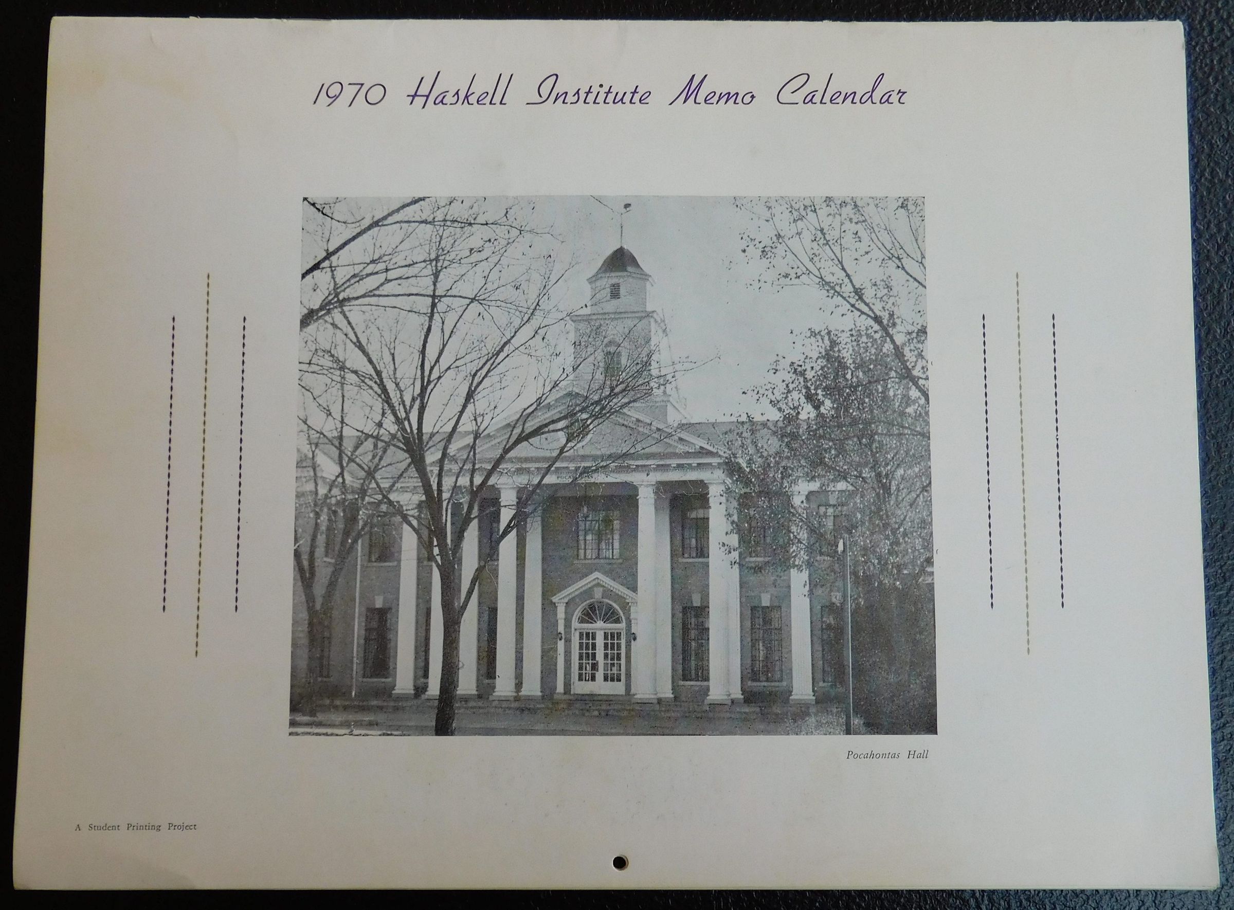 1970 Haskell Institute Memo Calendar, January-December. Each page has photos of students both male and female, their tribe, their current job, where they work (name and place), and starting salary.Collection