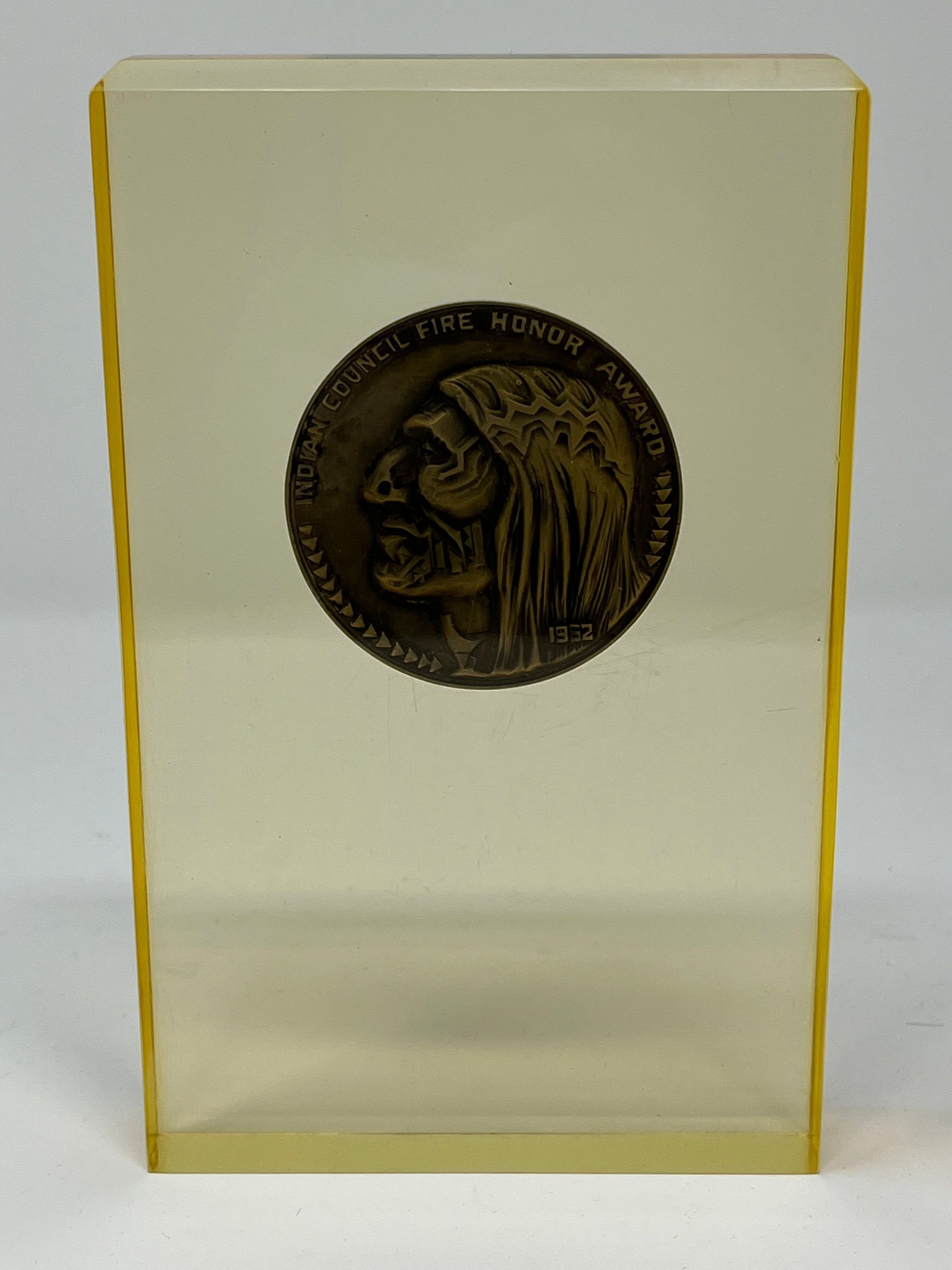 Plaque: clear, rectangular plaque with a single coin set in it. The coin has a side profile of a Native man and reads "Indian Council Fire Honor Award, 1962".Collection