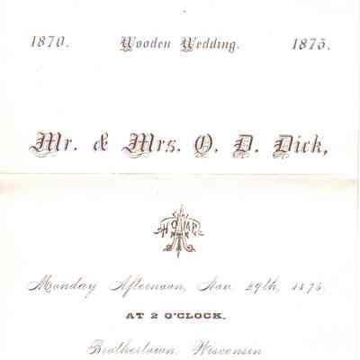 Wedding invite that reads "1870. Wooden Wedding. 1875. Mr. & Mrs. O.D. Dick, Monday Afternoon, Nov 29th, 1875 at 2 o'clock, Brothertown, Wisconsin". The invite is a folded piece of cardstock paper but only has content on the front.