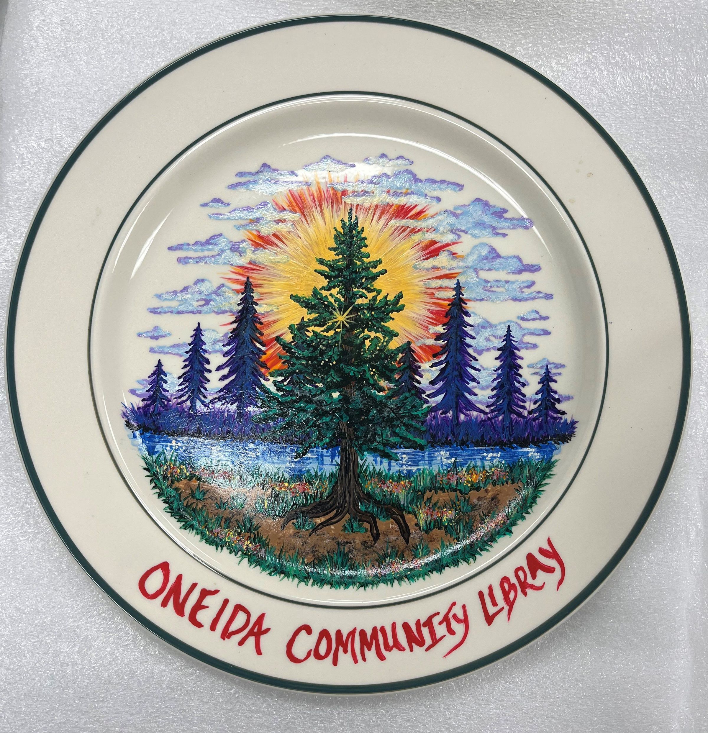 Porcelain plate with green trim and a painted tree with a sun behind it in front of water. Bottom has "Oneida Community Libray [sic]" painted in red. The back reads "the Great Tree of Peace, M.F.C. 8-26-95" in black paint and "To Bob, Thank you on behalf of your people! Oneida Library Staff" in green paint.Collection