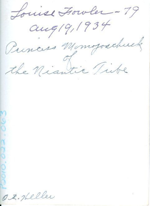 Written in black ink on BC2010.022.063A "Louise Fowler-79, Aug 19, 1934, Princess Momojoschuck? the Niantic Tribe" and in the bottom left corner "O.E. Heller".