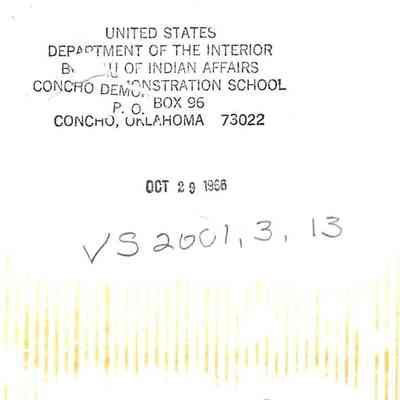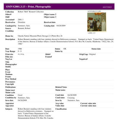 Colored photo of Robert Bennett with four children in Halloween costumes. From left to right: unknown mask in dress with pink sash around waist, football player, Robert Bennett, unknown costume with a baseball hat, unknown costume in a white robe and peaked hood. Stamped on the back "United States Department of the Interior, Bureau of Indian Affairs, Concho Demonstration School, P.O. Box 96, Concho, Oklahoma 73022" and "Oct. 29 1966".Collection