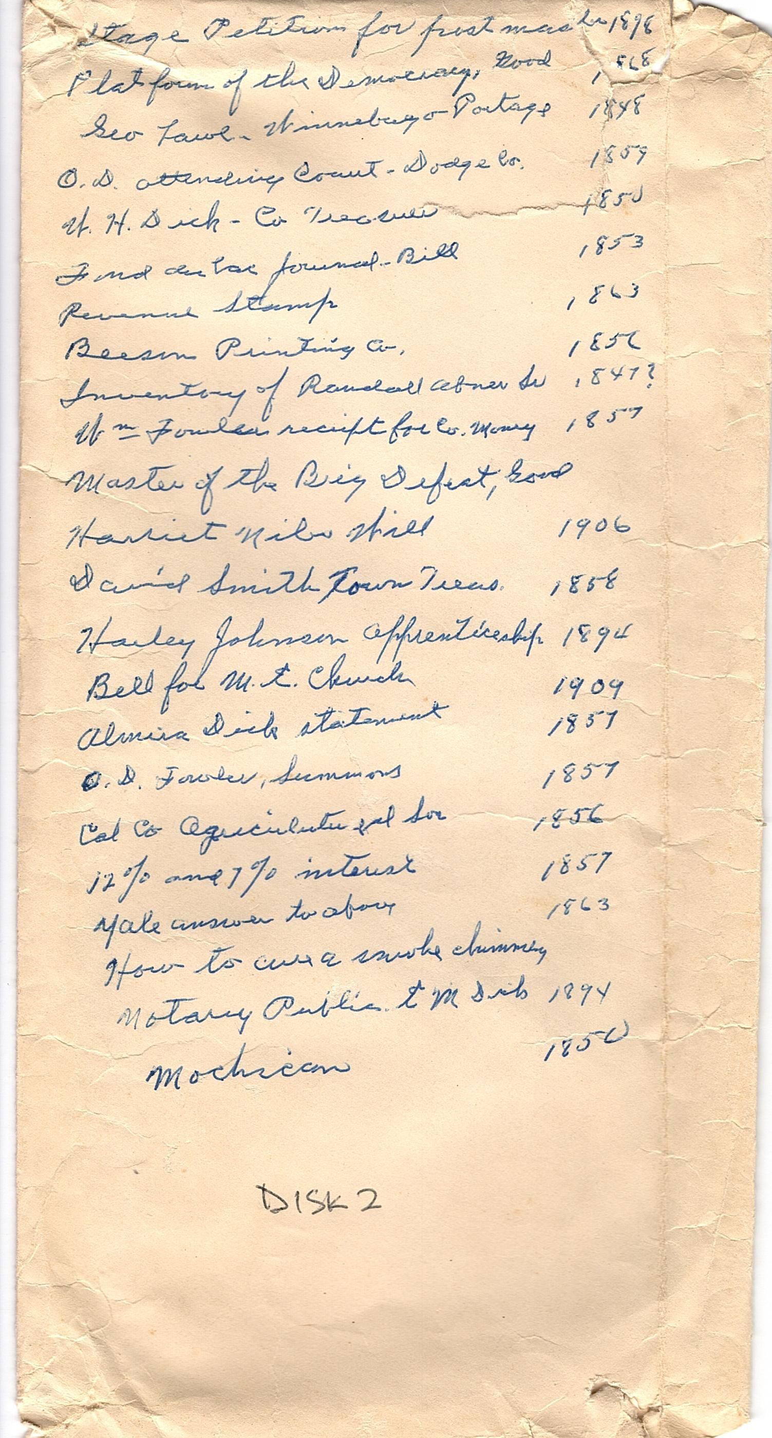 Legal sized envelope with a list of events and dates written in blue ink. The list is not in chronological order.