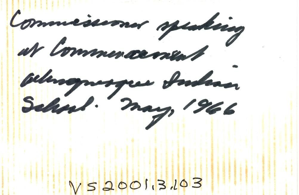 Colored photo of Robert Bennett speaking from behind a podium on a stage. Three men sit behind him and in front of a large cream colored stage curtain. Written on the back in black ink "Commissioner speaking at Commencement Albuquerque Indian School. May, 1966."Photograph Details