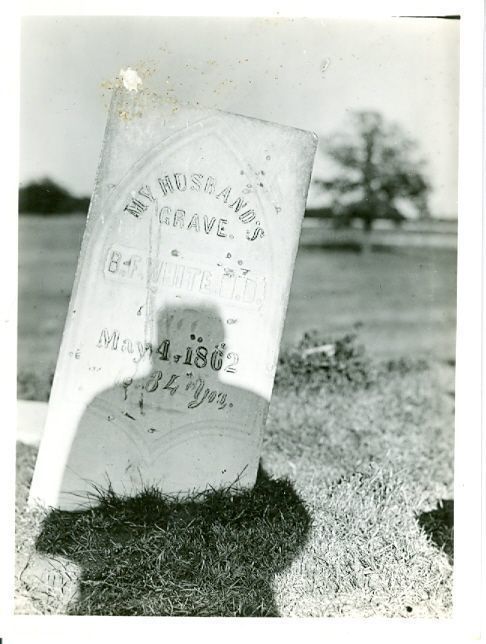 Black and white photo of B.F. White. It reads "My husband's grave B.F. White, M.D., May 4, 1862, 84 yrs." There is a
