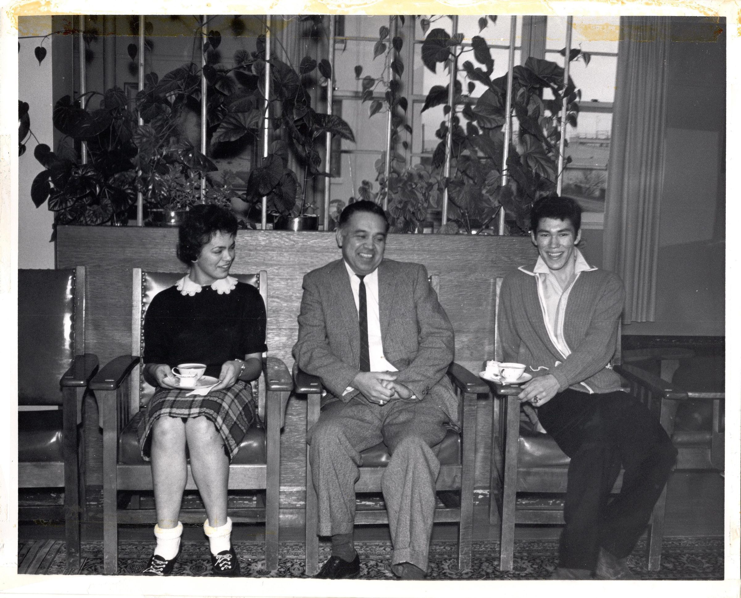 Black and white photograph of Robert Bennett sitting on a chair between 2 (two) youth: a female to Bennett's right and a male to his left. The two youth have tea/coffee cups.Photograph Details