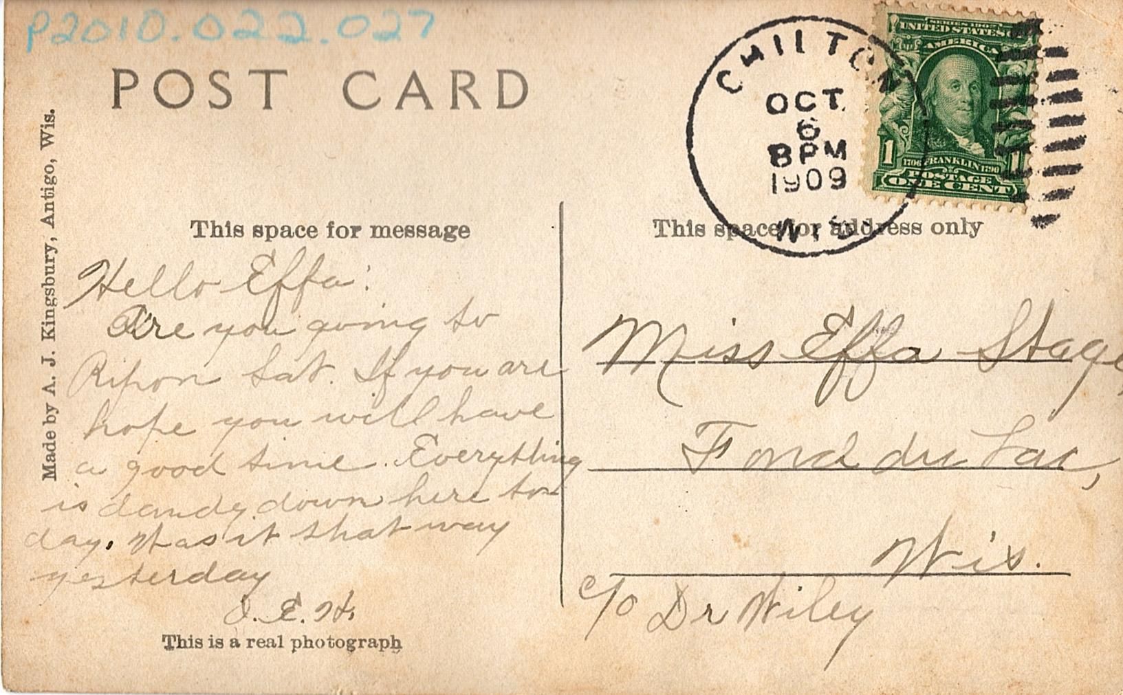 The back written in black ink, addressed to "Miss Effa Stage, Fond du Lac, WIs. c/o Dr. Wiley" is "Hello Effa: Are you