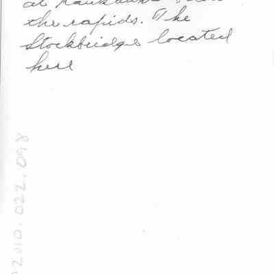 "South side of the Fox at Kaukauna below the rapids. The Stockbridge located here. 1937"Location