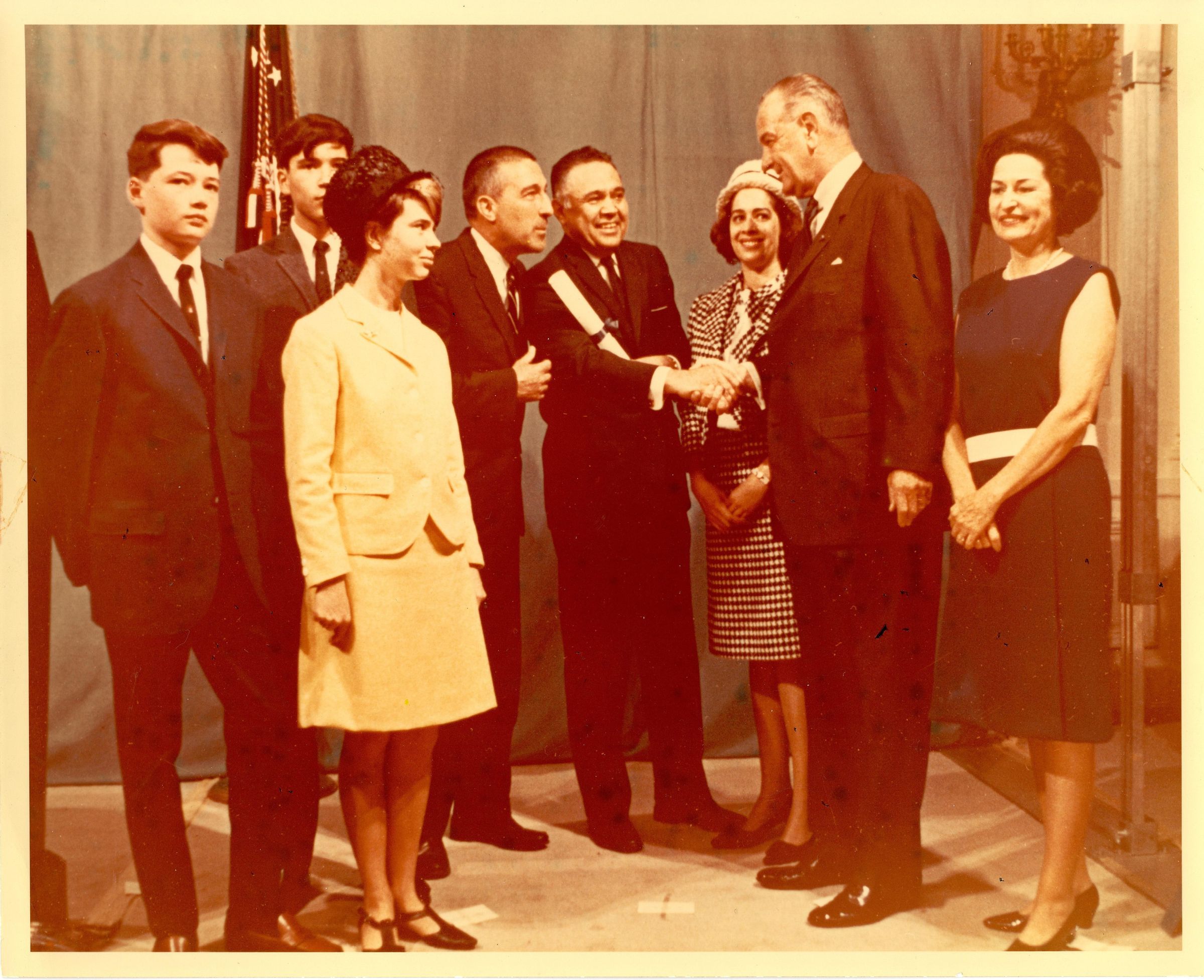 Colored photo of Robert Bennett shaking hands with Lyndon B. Johnson. Cleota Bennett is between Robert Bennett and President Johnson and Claudia Alta Johnson is next to Lyndon B. Johnson. There are four additional unknown people in the photo, mostly youth. (See notes)Photograph Details