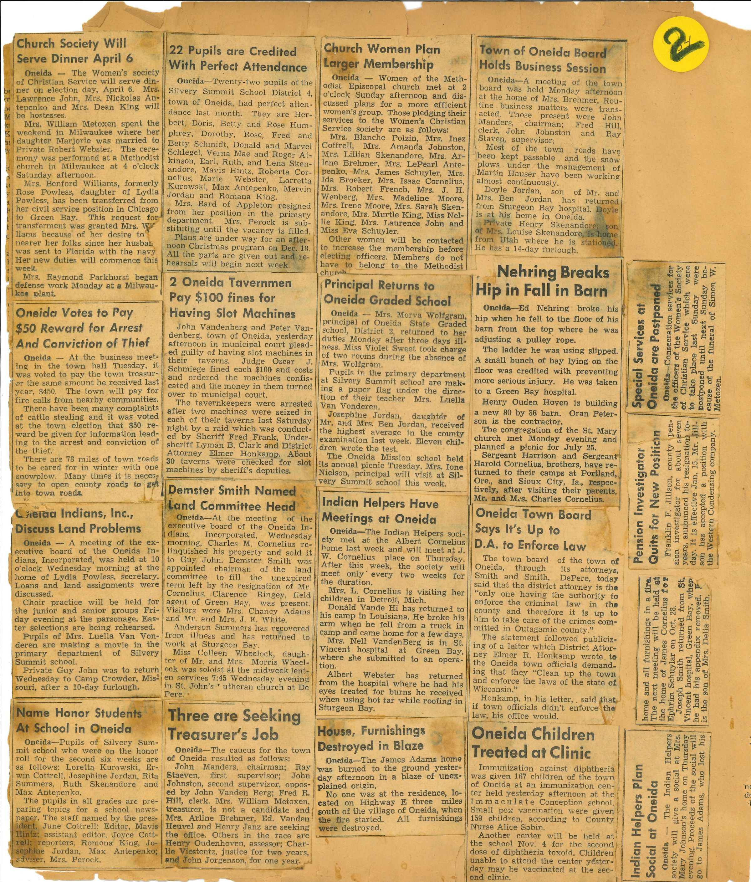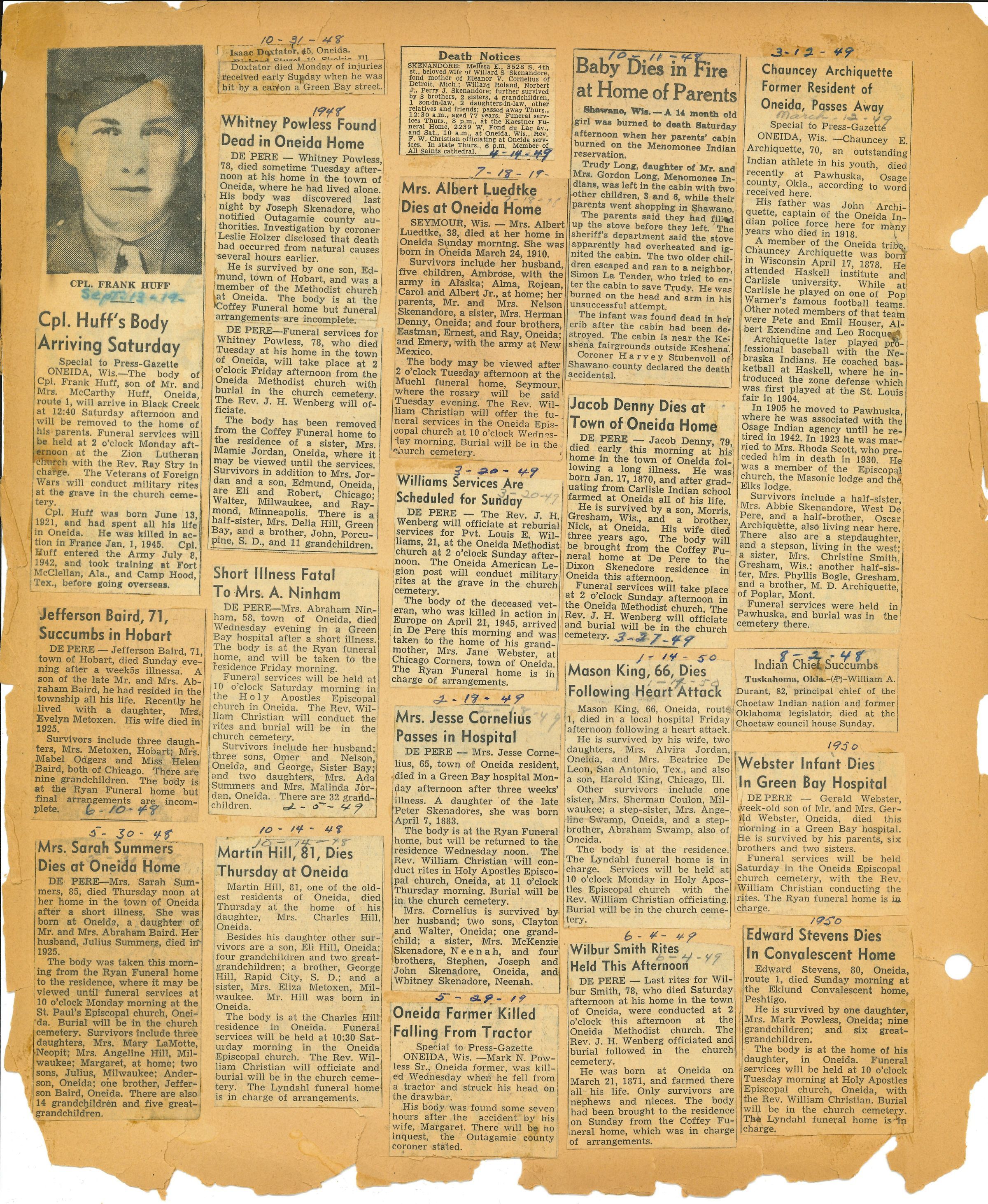 Pages of newspaper clippings glued to an old scrapbook that no longer has a cover.Collection