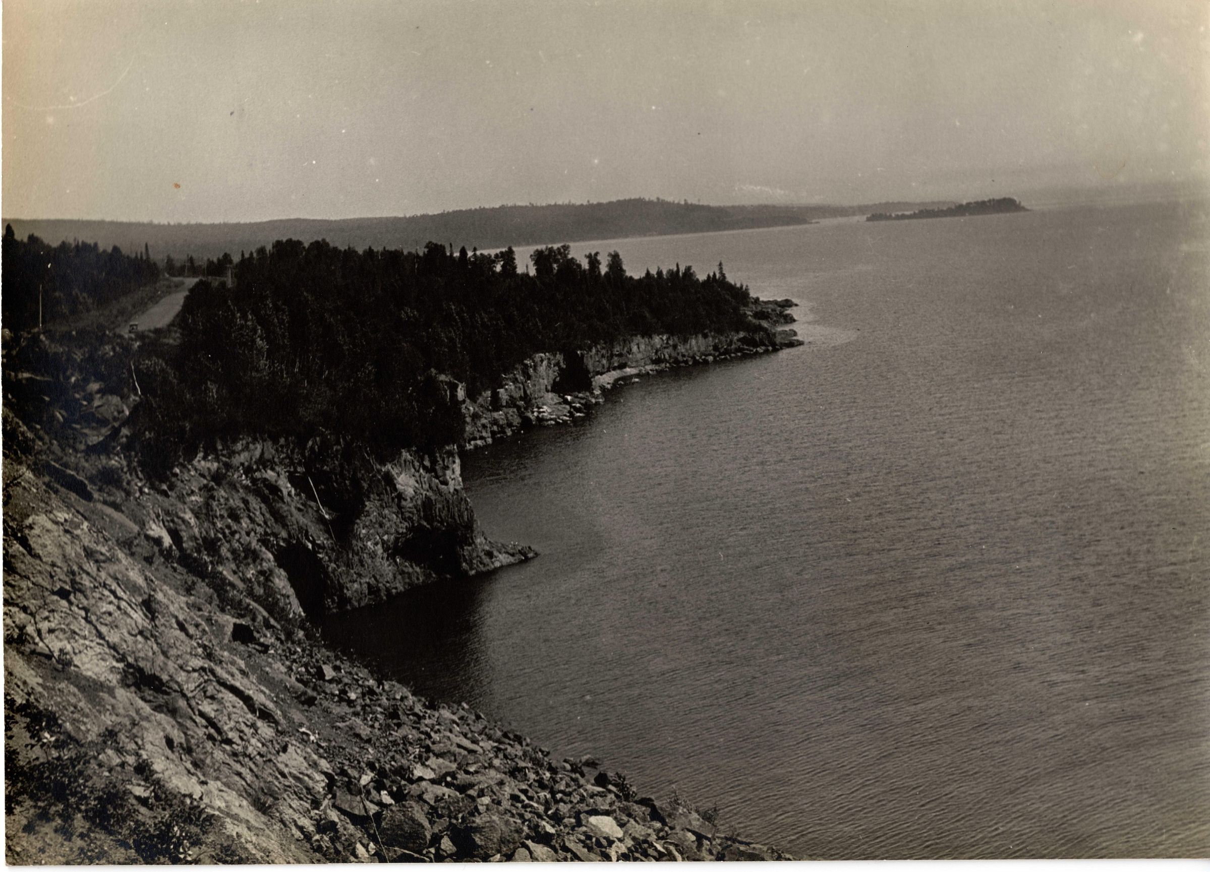 Black and white photograph of a body of water from a cliff edge. It looks across the coastline which is all cliffs.Collection