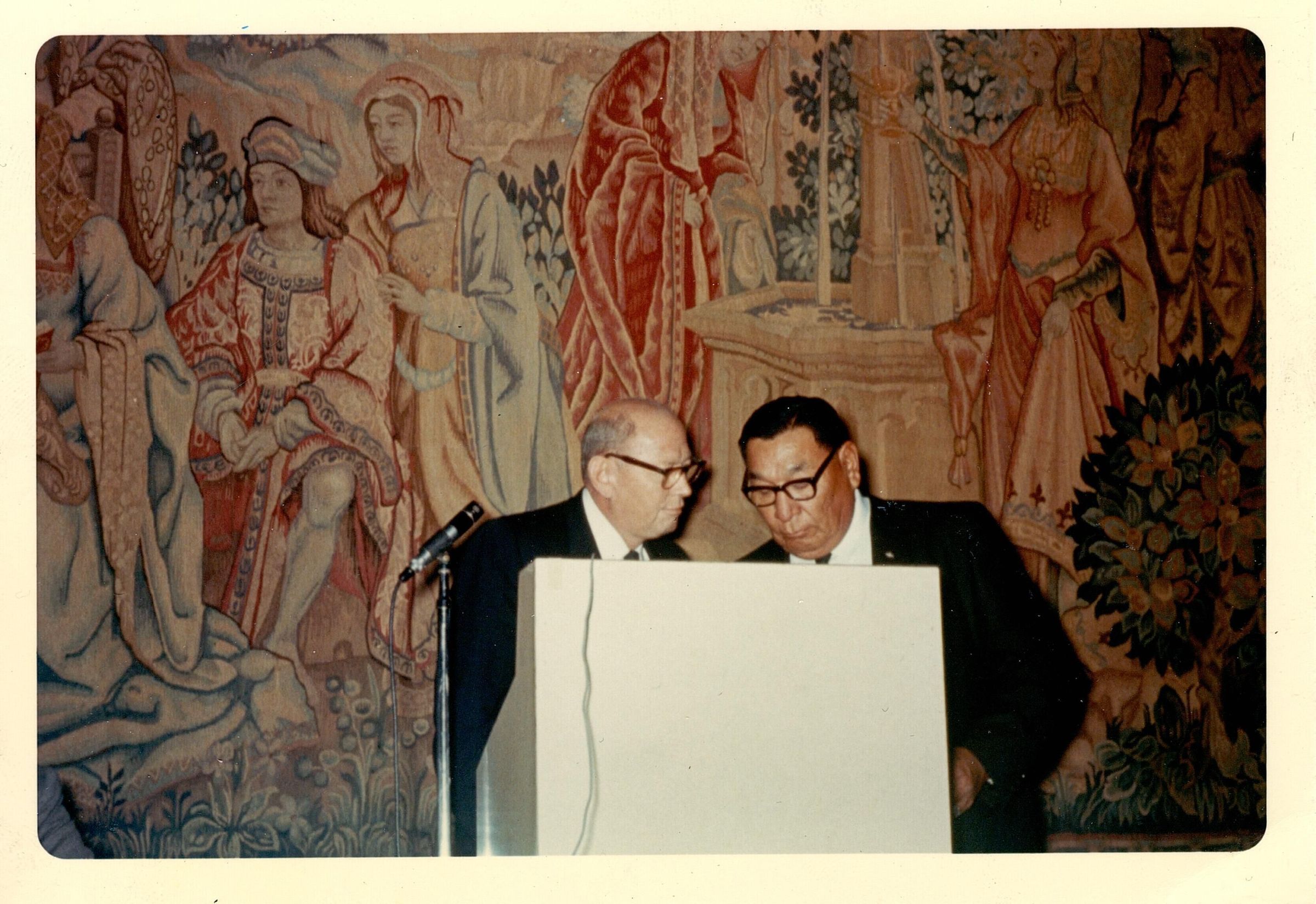 Colored photo of two men standing behind a podium with a large tapestry in the background of medieval men and women around a fountain. The back reads "James Cox, Comanche and conference co-chairman, discusses a question with Robert Whitebird, Quapaw Chairman, during the presentation of committee reports."Photograph Details