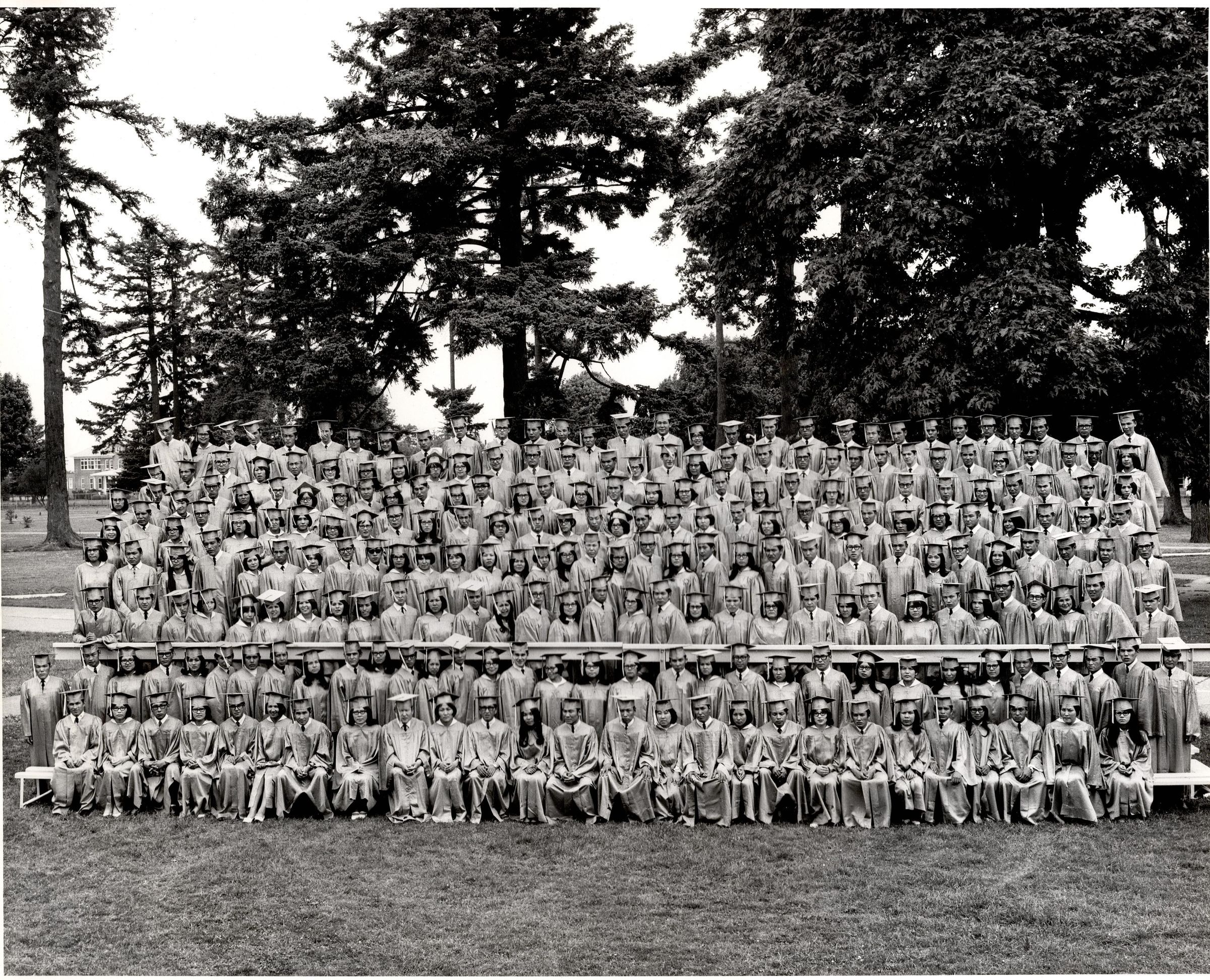 Black and white photo of graduating class outside on bleachers. There are eight rows of graduates all in caps and gowns. Graduation from Chemawa Indian School, 1969.Photograph Details