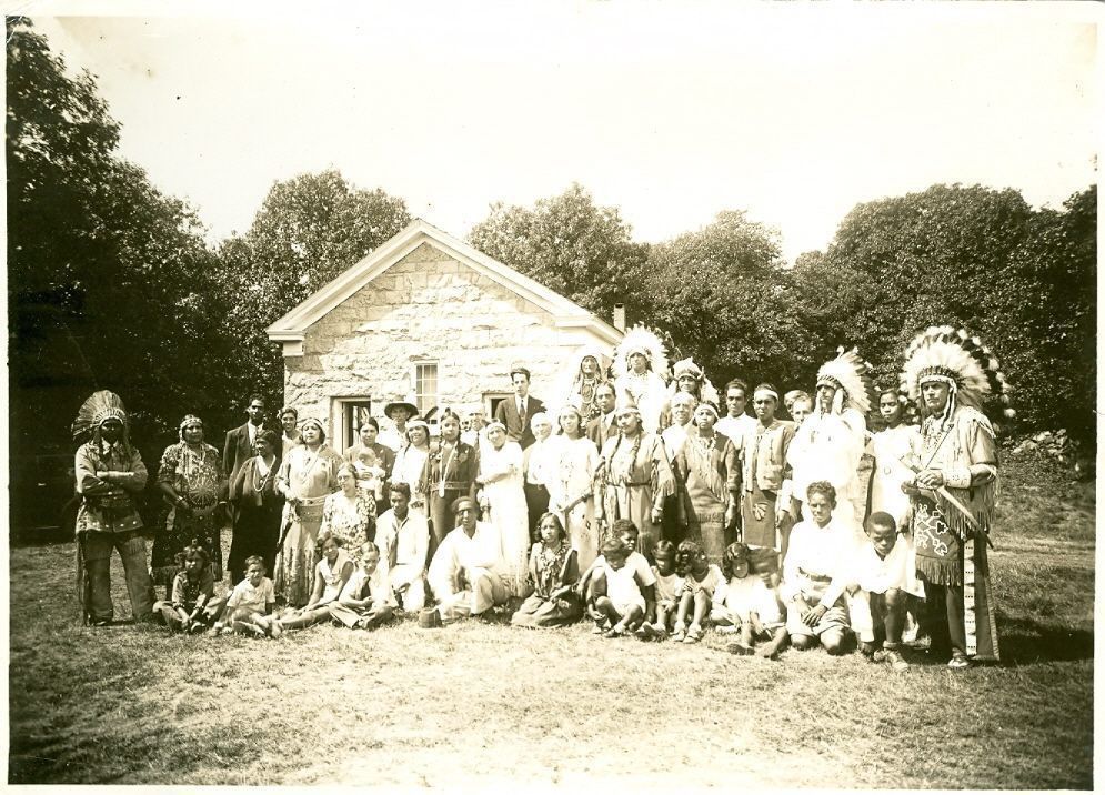 Black and white photograph of a group of Natives standing in front of a small large brick building. They are wearing headdresses, leather, and buckskin. The adults are mostly standing in the back in two rows and the children are sitting on the ground. It is a mix of men and women.