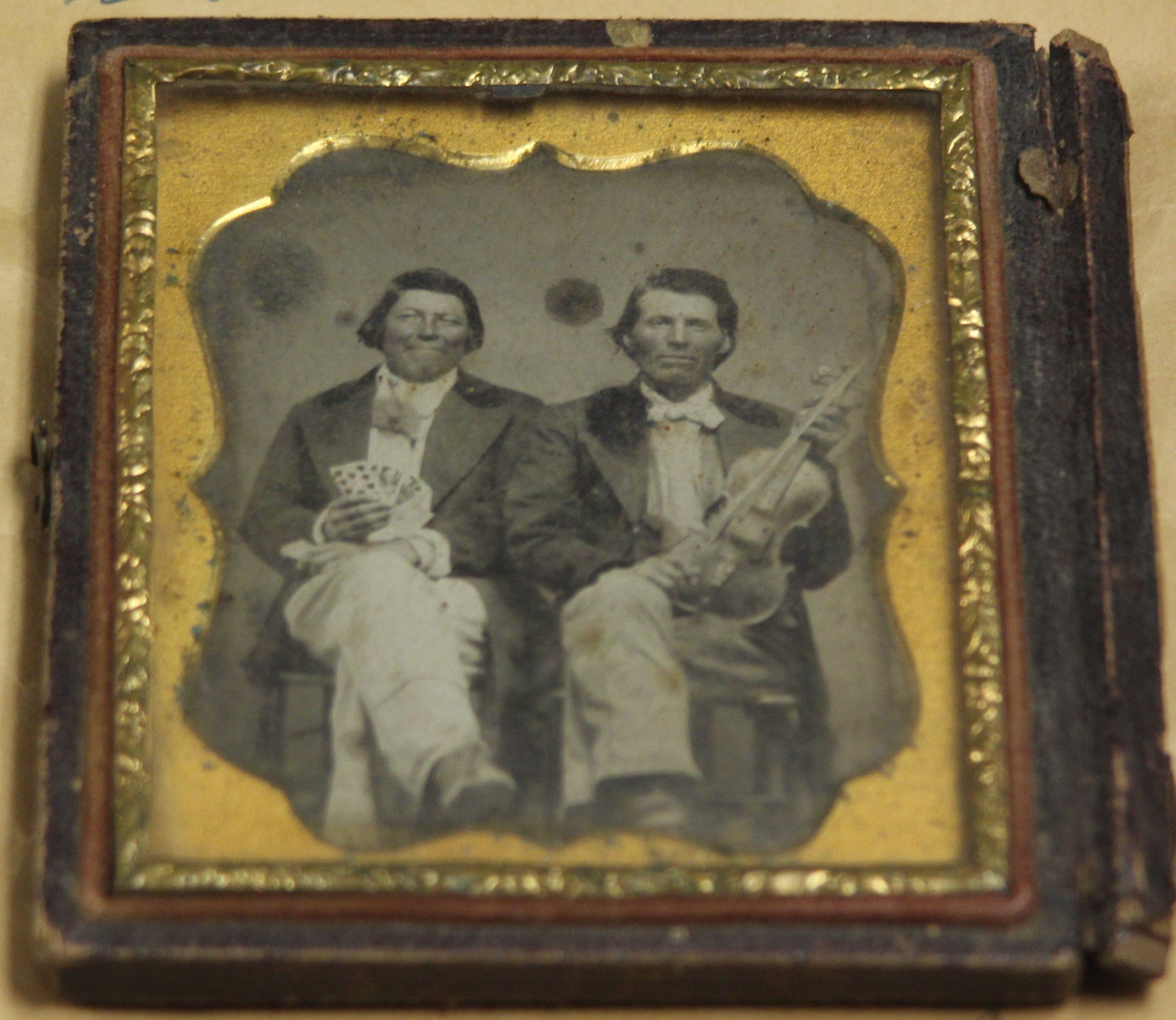 Tintype of two men sitting with the legs crossed in suits and bow ties. The man on the left is holding a hand of cards, fanned out, and facing the camera. The man on the right is holding a violin and bow. The tintype is framed in a latched book with a gold metal decorative frame around the image. The outside of the book (the cover) is of a bouquet of flowers in a circle and flourishes in each of the corners. It is a brown color. The tintype was housed in a brown colored envelope with "Syman P Fowler with violin" and #43. This is most likely O.E. Heller's organization system.