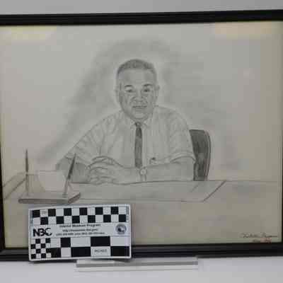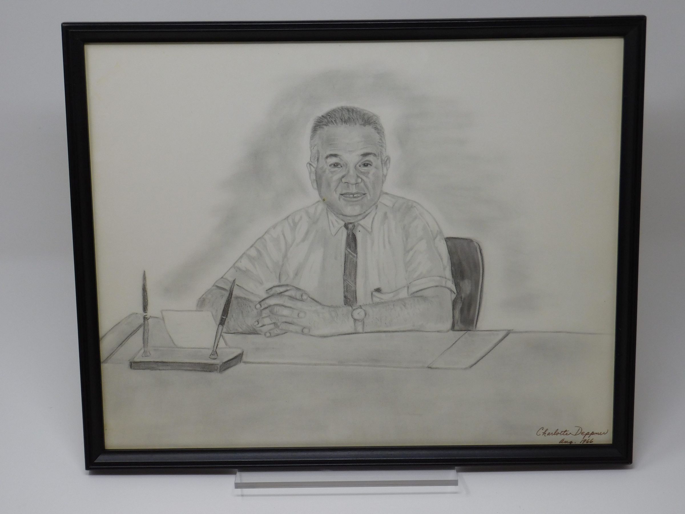 Framed pencil drawing of Robert Bennett sitting at a desk with his hands clasped in front of him and two pens in a holder. Drawing by Charlotte Deppner, August 1966.Collection