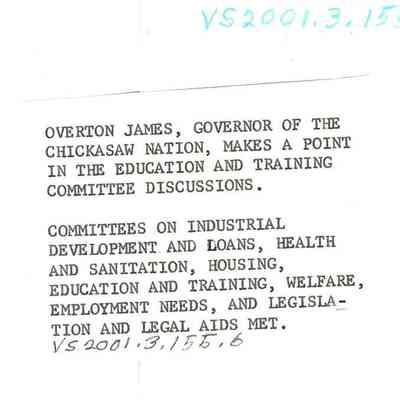 Colored photo of a man standing and addressing a room of individuals all sitting. The back reads "Overton James, Governor of the Chickasaw Nation, makes a point in the education and training committee discussions. Committees on Industrial Development and Loans, Health and Sanitation, Housing, Education and Training, Welfare, Employment Needs, and Legislation and Legal Aids met."Photograph Details