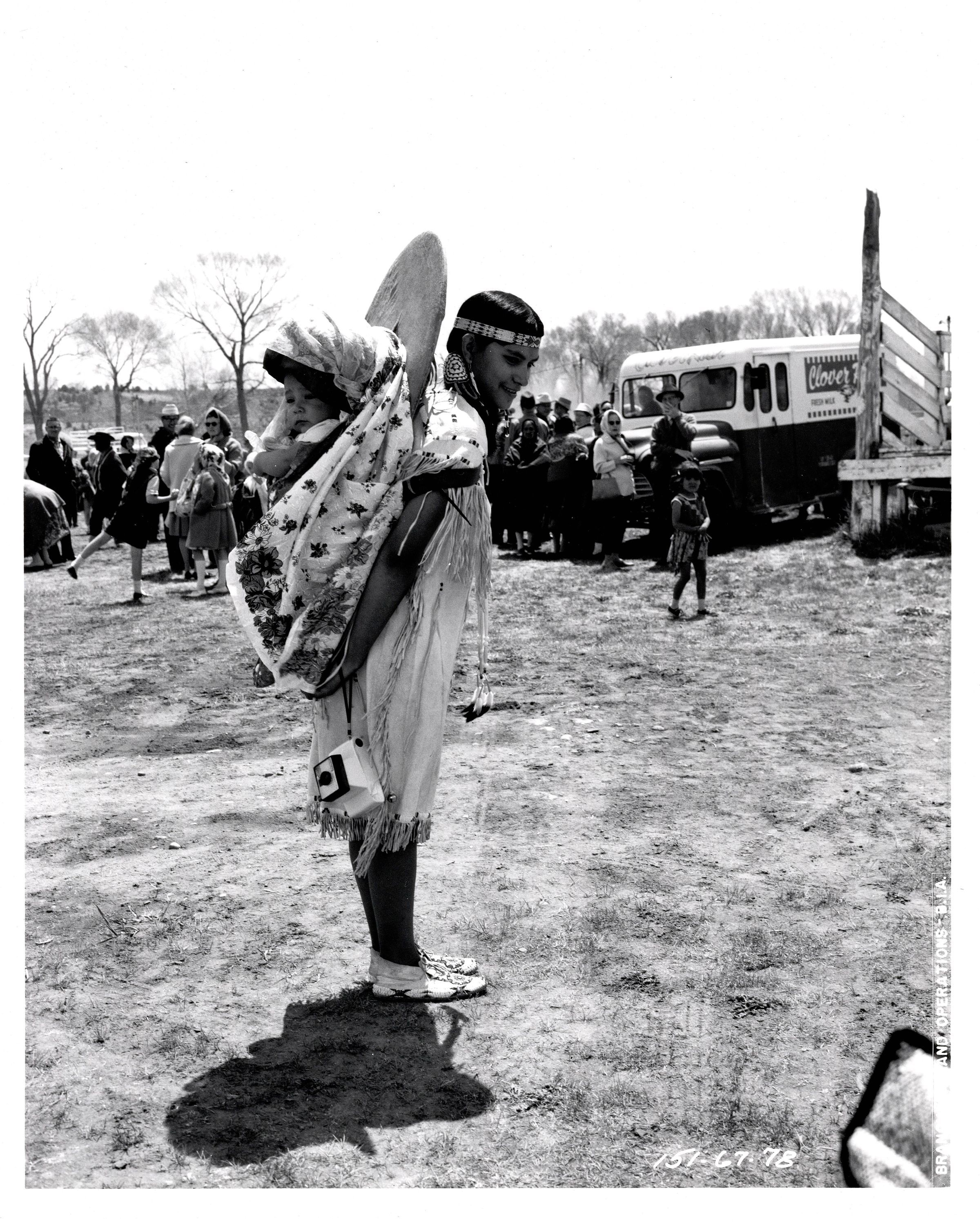Black and white photograph of a woman in a buckskin dress with fringe along the bottom, sleeves, and down the sides. She is also wearing a headband and a barrette in her hair. On her back is a cradleboard with a small child in it and a blanket over the back of the headrest. There is a crowd of people in the background and a truck that reads "Clover".Collection