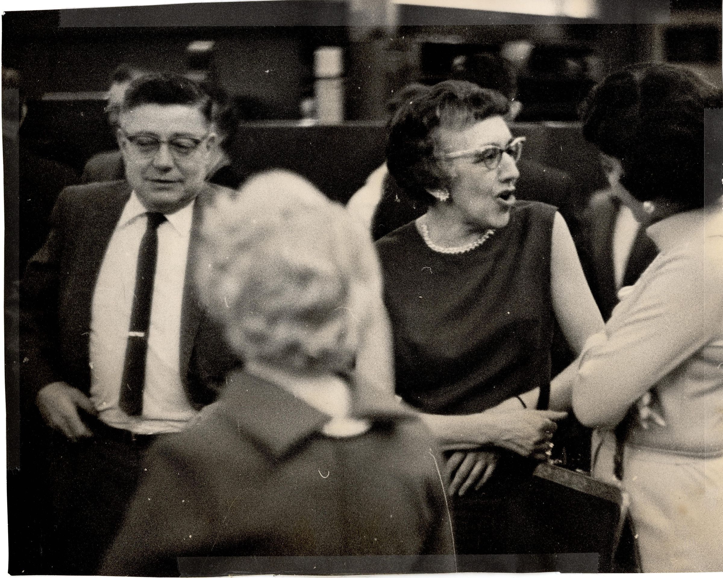 Black and white photograph of four individuals (one man and three women). Two of the woman are talking to one another, the man is pulling at his belt, and one woman is only seen from behind.Collection