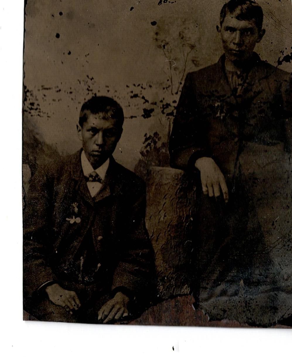 The tintype has an uneven bottom edge, could have been broken off. There are dark stains along the middle of the image and the bottom right corner is disintegrating.Relationships