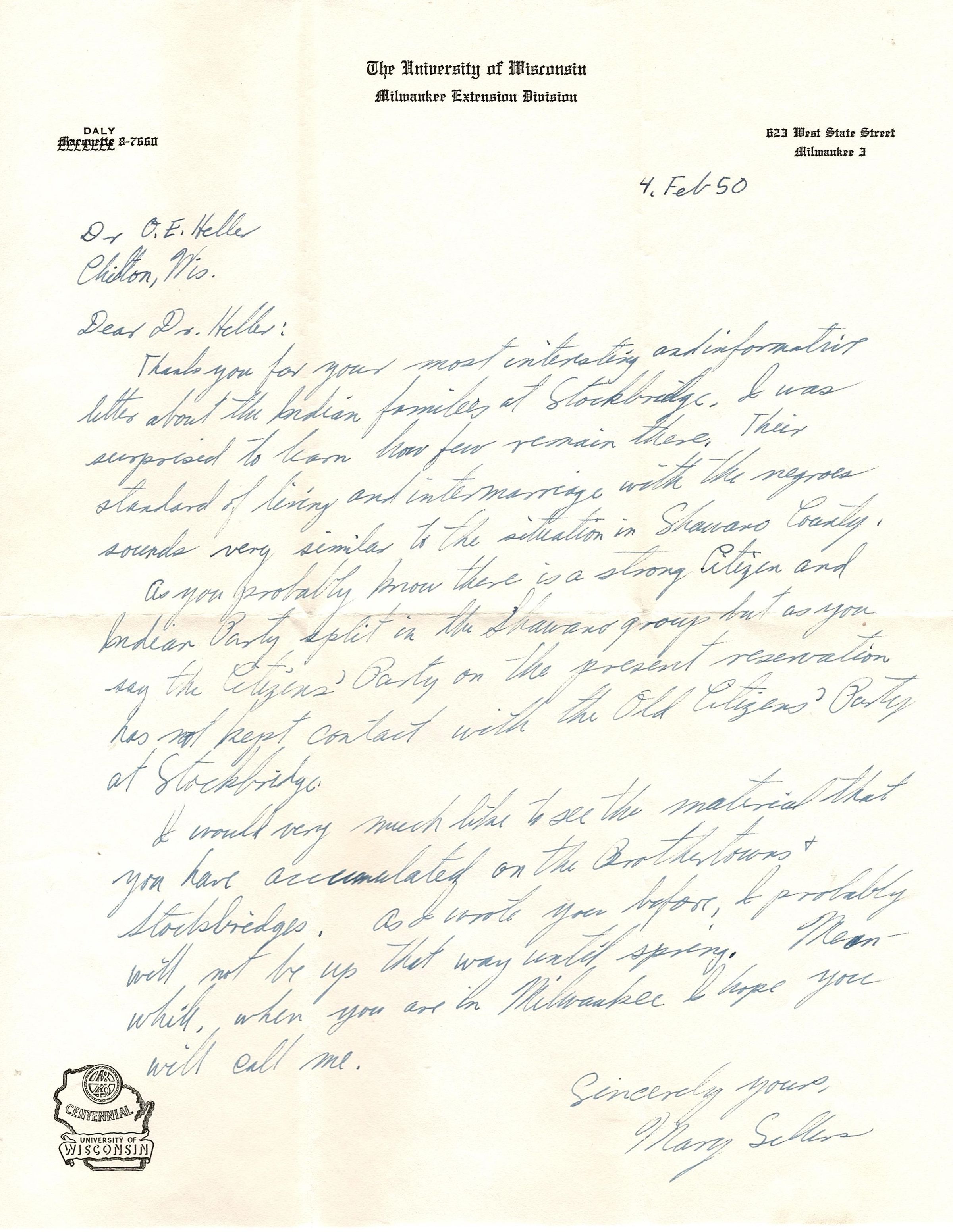 Single page correspondence written on The University of Wisconsin Milwaukee Extension Division letterhead paper. It is addressed to Dr. O.E. Heller of Chilton, Wisconsin and written on Feb. 4, 1950. It is a response to Heller's letter about the Stockbridge Indians and relates his information to that of the Shawano Indians. It is signed "Sincerely yours, Mary Sellers.