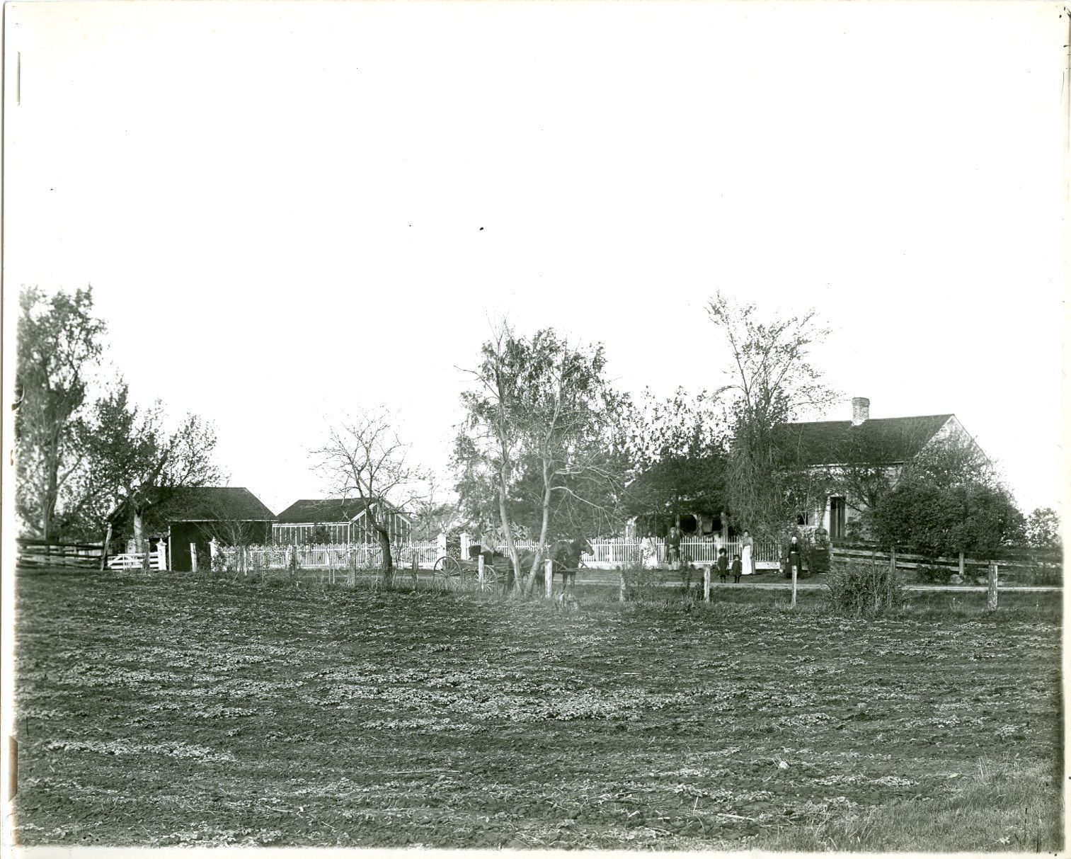 Black and white photograph of a farm behind a plowed field. There is a horse pulling a buggy with a man sitting in it near