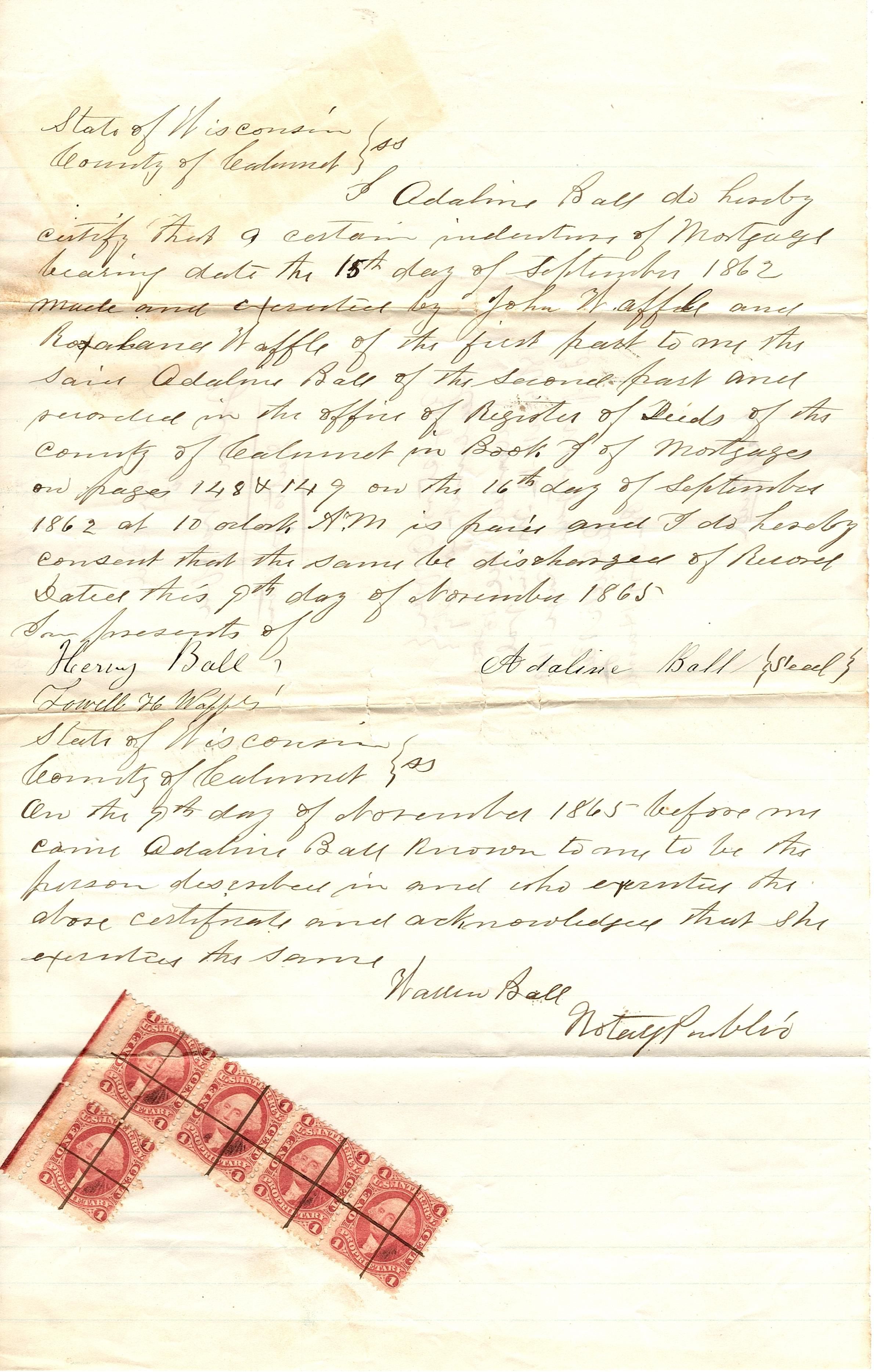 Legal sized official document-satisfaction of mortgage. Written in black ink on lined paper, the satisfaction is between Adaline Ball to John Waffle. Register's Office Calumet County. Recorded Dec. 15th, 1865. There are five 1 cent stamps at the bottom of the page in two rows (first row has 4 stamps and second only has 1). The original mortgage has a different last name for Adaline, but the forms were together in the collection.Collection