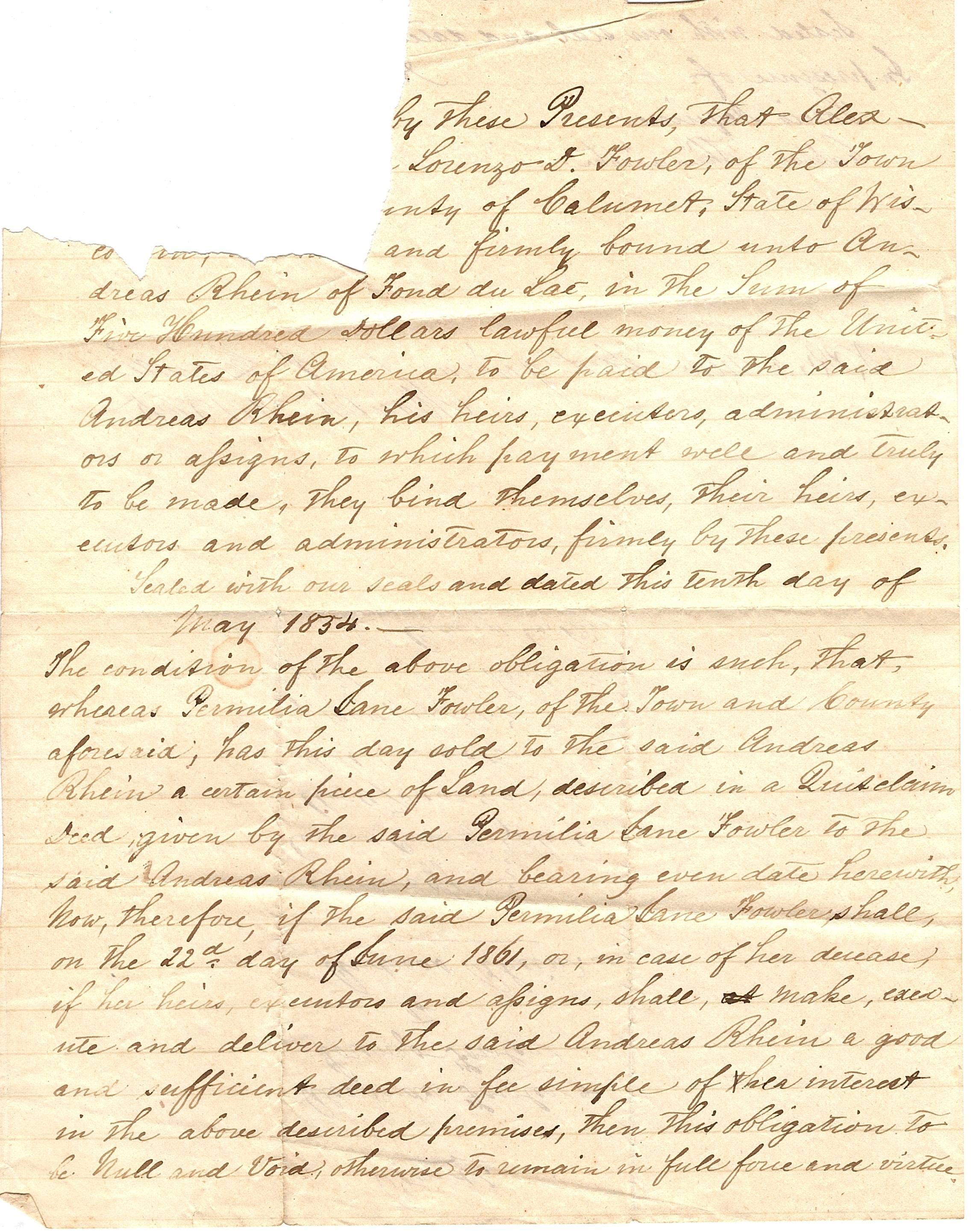 Hand written document on lined paper. Alexander Fowler and Lorenzo Fowler to Andreas Rhien. Registers Office, Calumet Count. Received May 11th, 1854. It addresses the sale of land between the parties and the payment that must be made.Collection