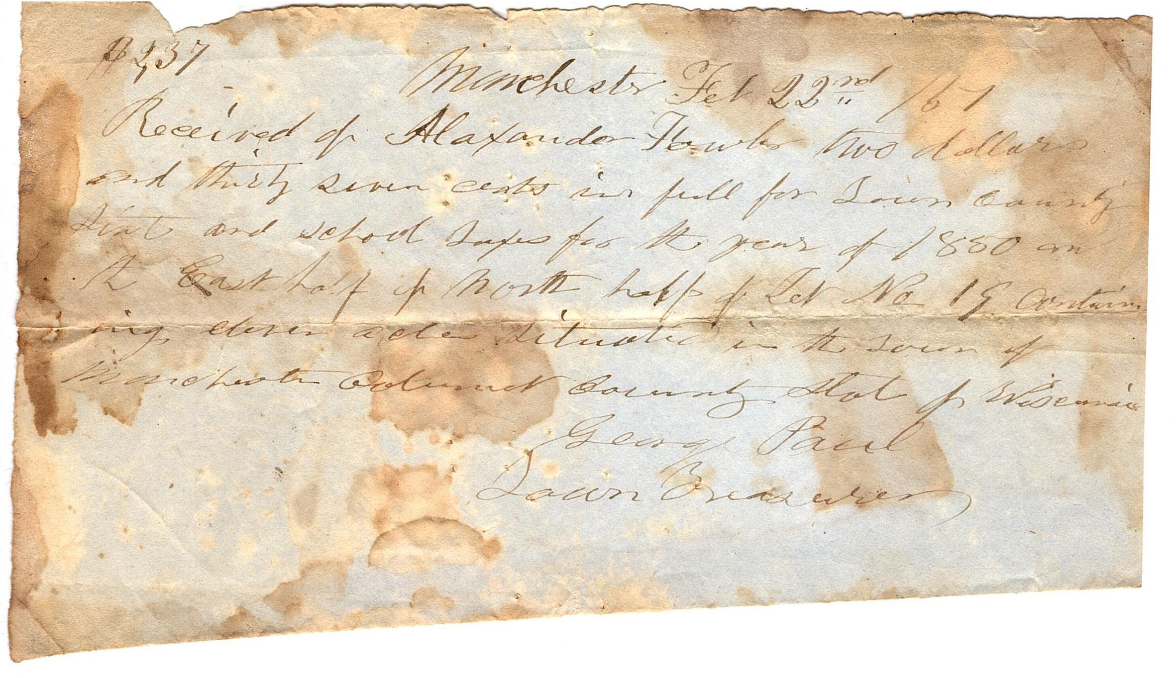 Half sheet of blue paper with writing in black ink that reads "$2,37 Manchester Feb 22nd /51, Received of Alexander Fowler two dollars and thirty seven cents in full for town county Dist and school taxes for the year of 1850 on -- East half of North half of Lot No 19, containing eleven acres situated in the town of Manchester Calumet County State of Wisconsin." It is signed by George Paul, Town Treasurer.Collection
