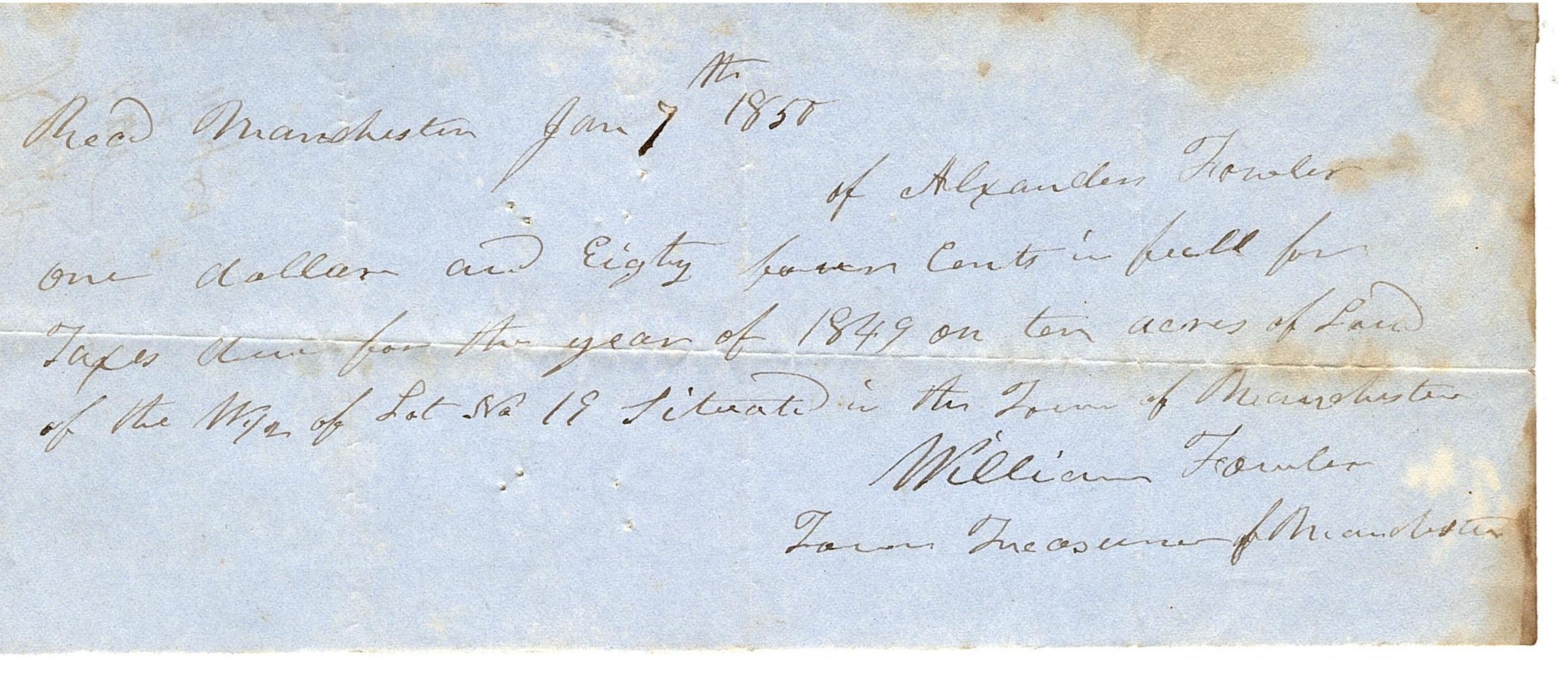 Small piece of blue paper that has writing in black ink that reads "Rec'd Manchester Jan 7th 1850, of Alexander Fowler one dollar and eighty seven cents in full for taxes -- for the year of 1849 on ten acres of Land of the W 1/2 of Lot No 19 situated in the town of Manchester". The receipt is signed by William Fowler, Town Treasurer of Manchester. The back reads "Recpt for taxes"Collection