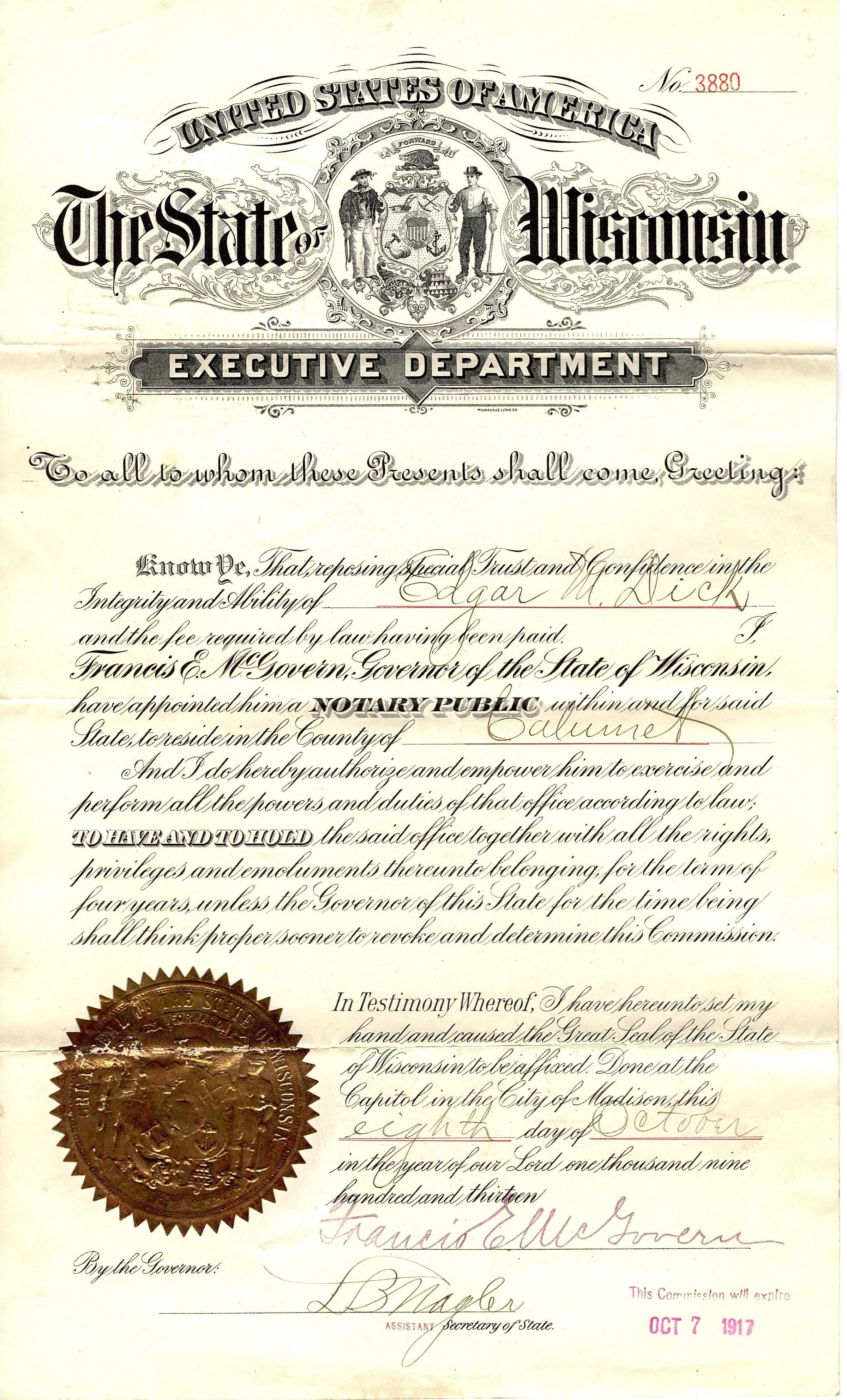 Official document-appointment letter. Large United States of America, the State of Wisconsin, Executive Department letterhead at the top with the Wisconsin seal in the middle. No. 3880 is in the top right corner in red. The certificate appoints Edgar M. Dick as a Notary Public for Calumet County. There is a large gold foil seal in the bottom left corner. It is signed by the governor (Francis G. McGovern) and the Secretary of State (L.B. Magler).Collection