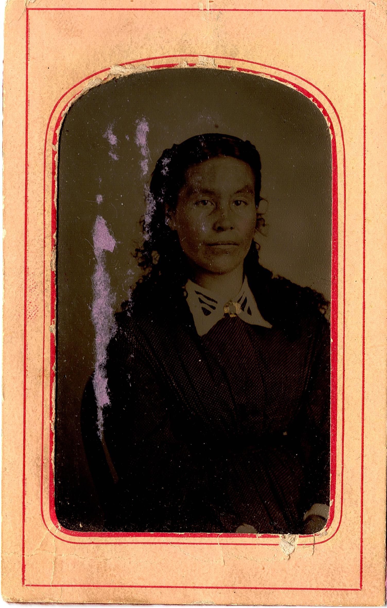 Tintype of a young woman wearing a dark long sleeved shirt/dress with triangle shaped light colored collar. Her hair is half up. The tintype is glued to a pinkish piece of paper with red lined borders. The back is glued to a purple piece of construction paper. The tintype was stored in an envelope with "Authelia Fowler, Millards Mother, #56." This is most likely O.E. Heller's organization system.