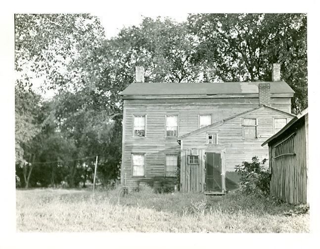 Black and white photograph of the back of a two story, wood sided house.