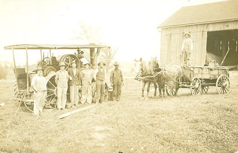 Black and white postcard of a group of men in front of two wagons and a barn. The wagon on the left has a roof/covering