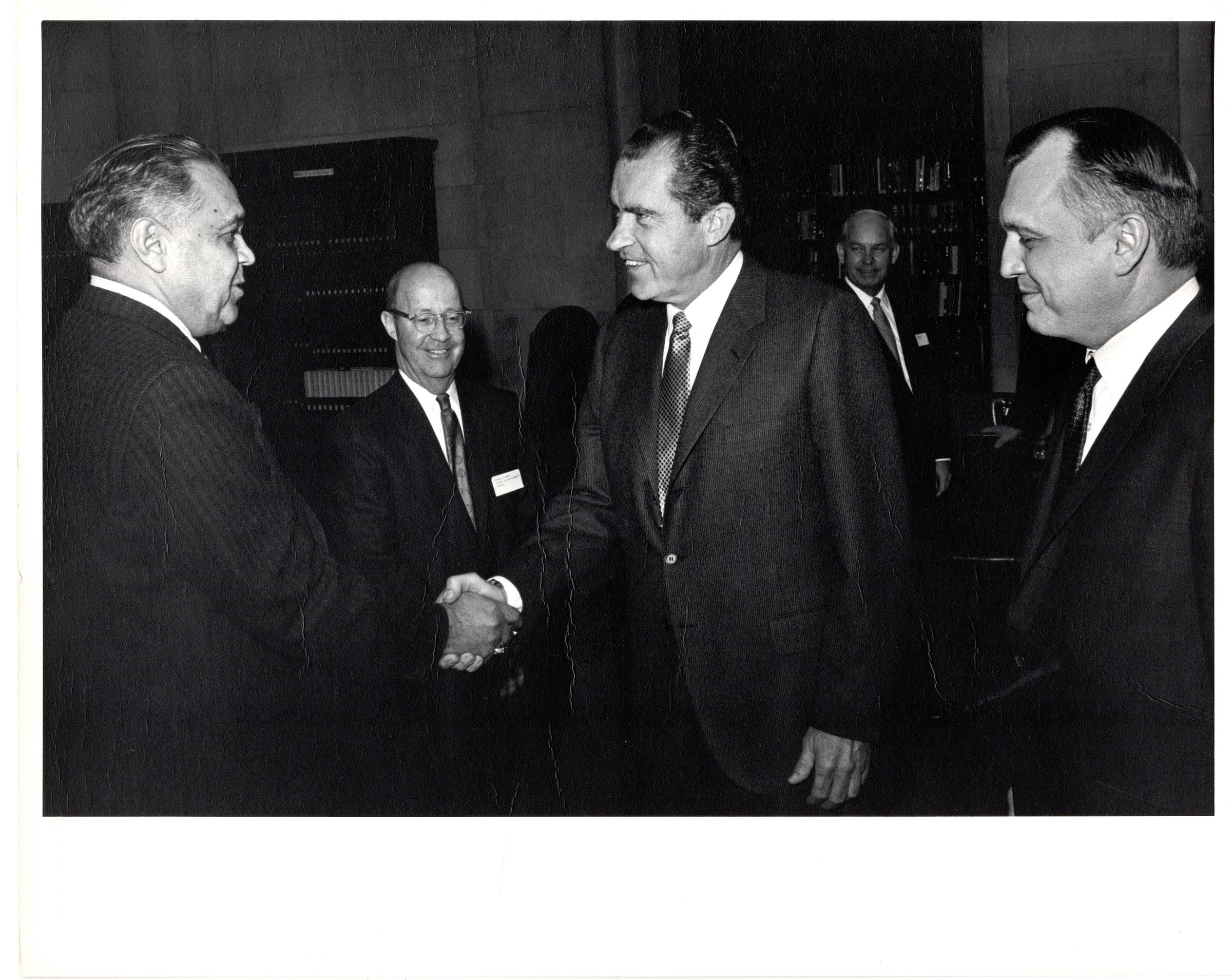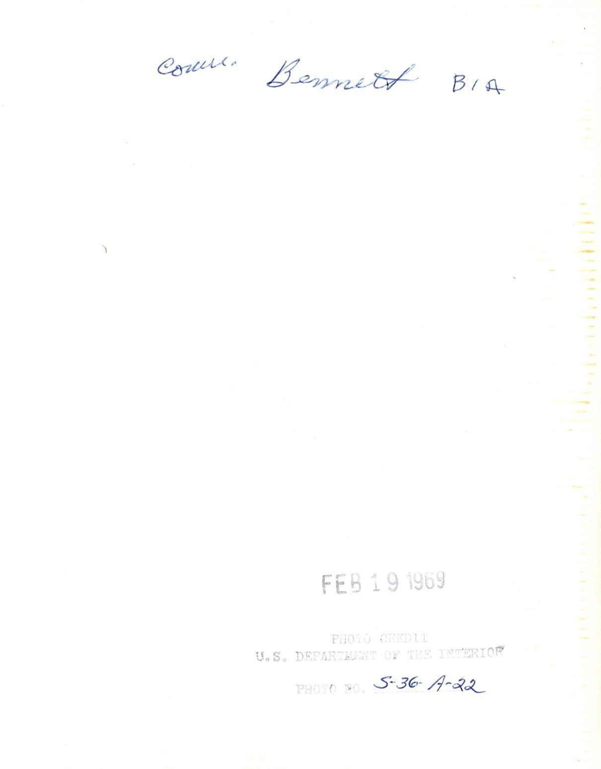 Black and white photograph of Commissioner Robert Bennett shaking hands with President Richard Nixon. Three other men are in the photo looking on as the two men shake hands. Back reads "Comm. Bennett BIA" in blue ink and in the bottom right corner stamped is "Feb 19 1969, Photo Credit U.S. Department of the Interior, Photo No. S-36-A-22".Photograph Details
