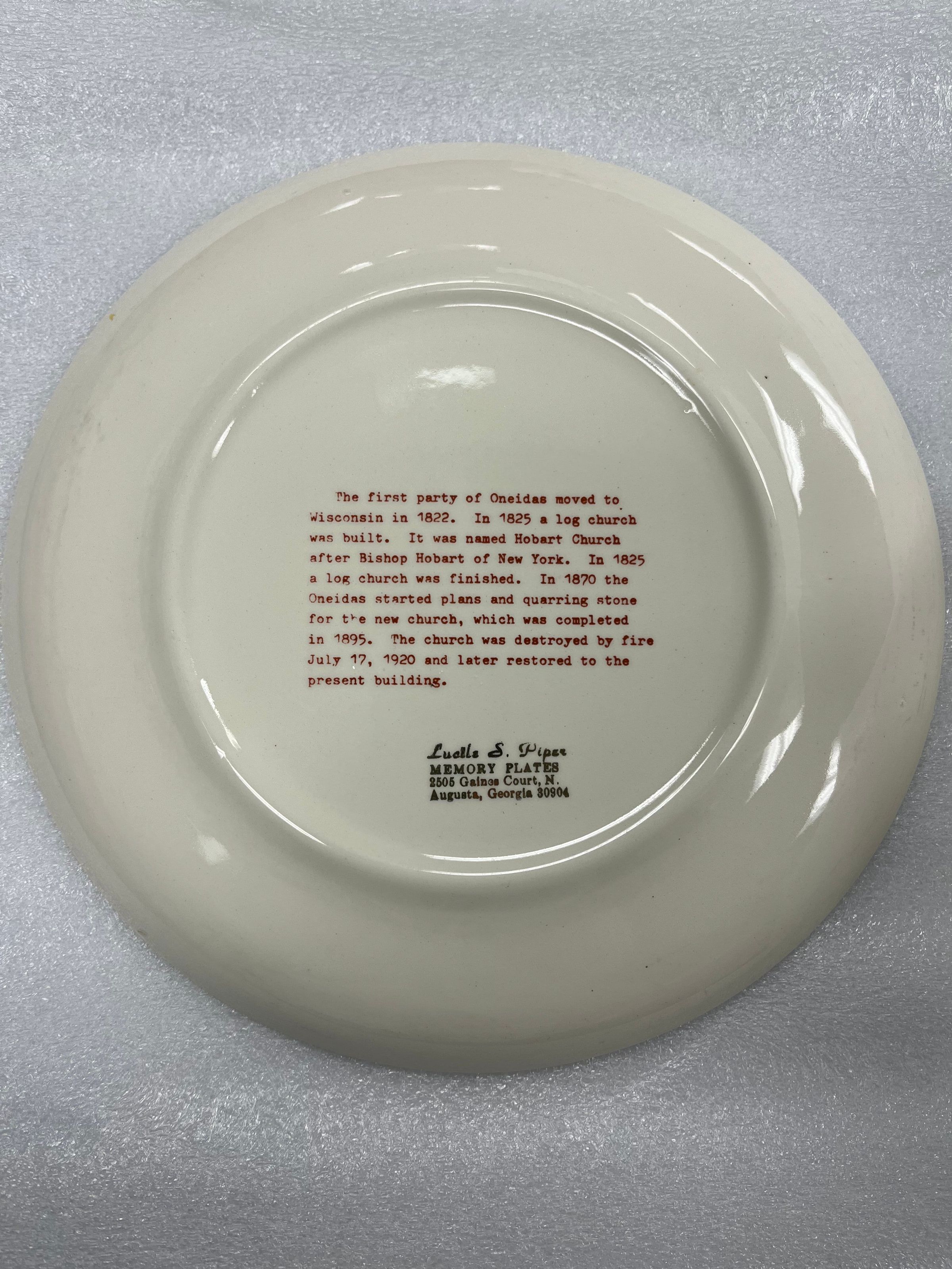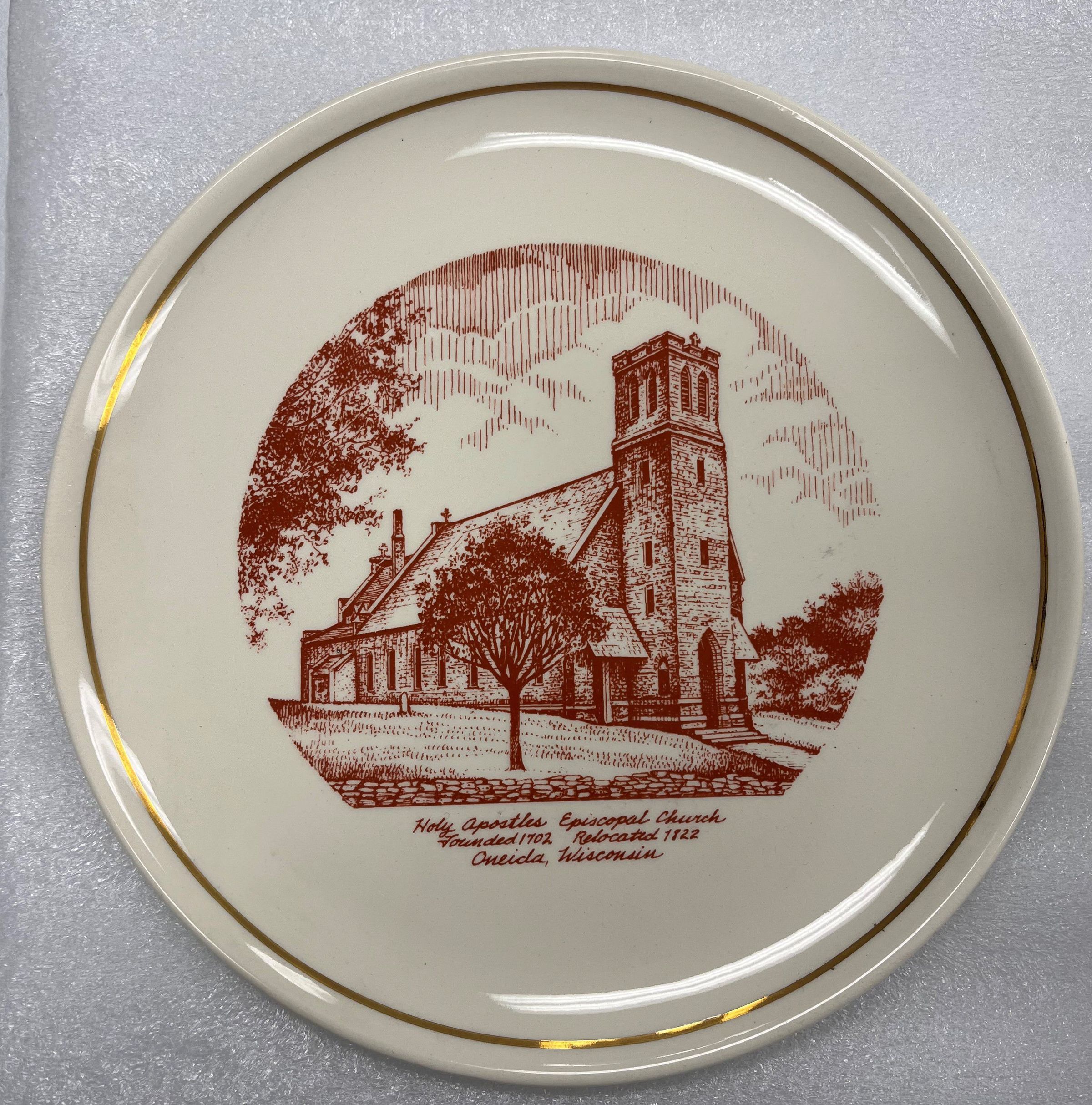 Porcelain plate with gold trim and an image of the stone church (Holy Apostles) in a red tint in the center. The bottom reads "Holy Apostles Episcopal Church, Founded 1702 Relocated 1822, Oneida, Wisconsin". The back has text in the same reddish tint that reads "The first party of Oneidas moved to Wisconsin in 1822. In 1825 a log church was built. It was named Hobart Church after Bishop Hobart of New York. In 1825 a log church was finished. In 1870 the Oneidas started plans and quarring stone for the new church, which was completed in 1895. The church was destroyed by fire July 17, 1920 and later restored to the present building".