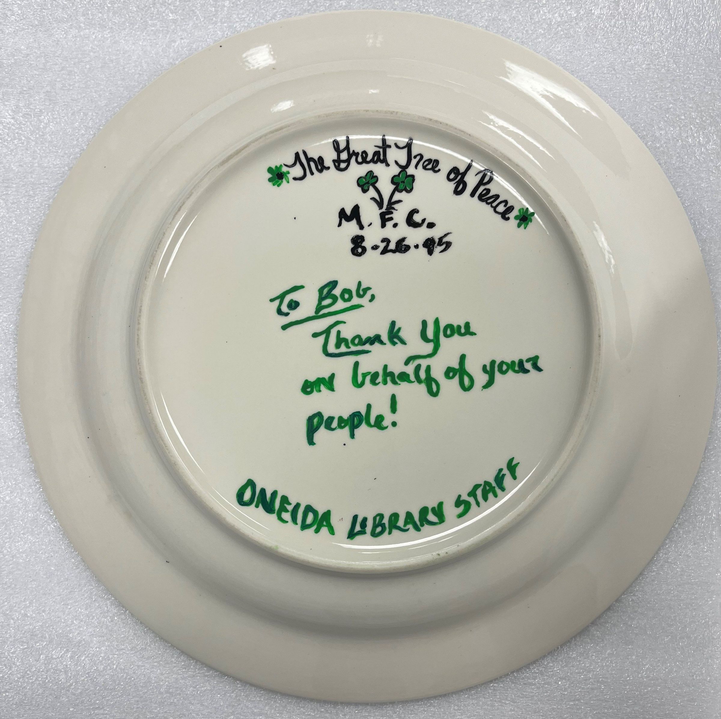 Porcelain plate with green trim and a painted tree with a sun behind it in front of water. Bottom has "Oneida Community Libray [sic]" painted in red. The back reads "the Great Tree of Peace, M.F.C. 8-26-95" in black paint and "To Bob, Thank you on behalf of your people! Oneida Library Staff" in green paint.Collection