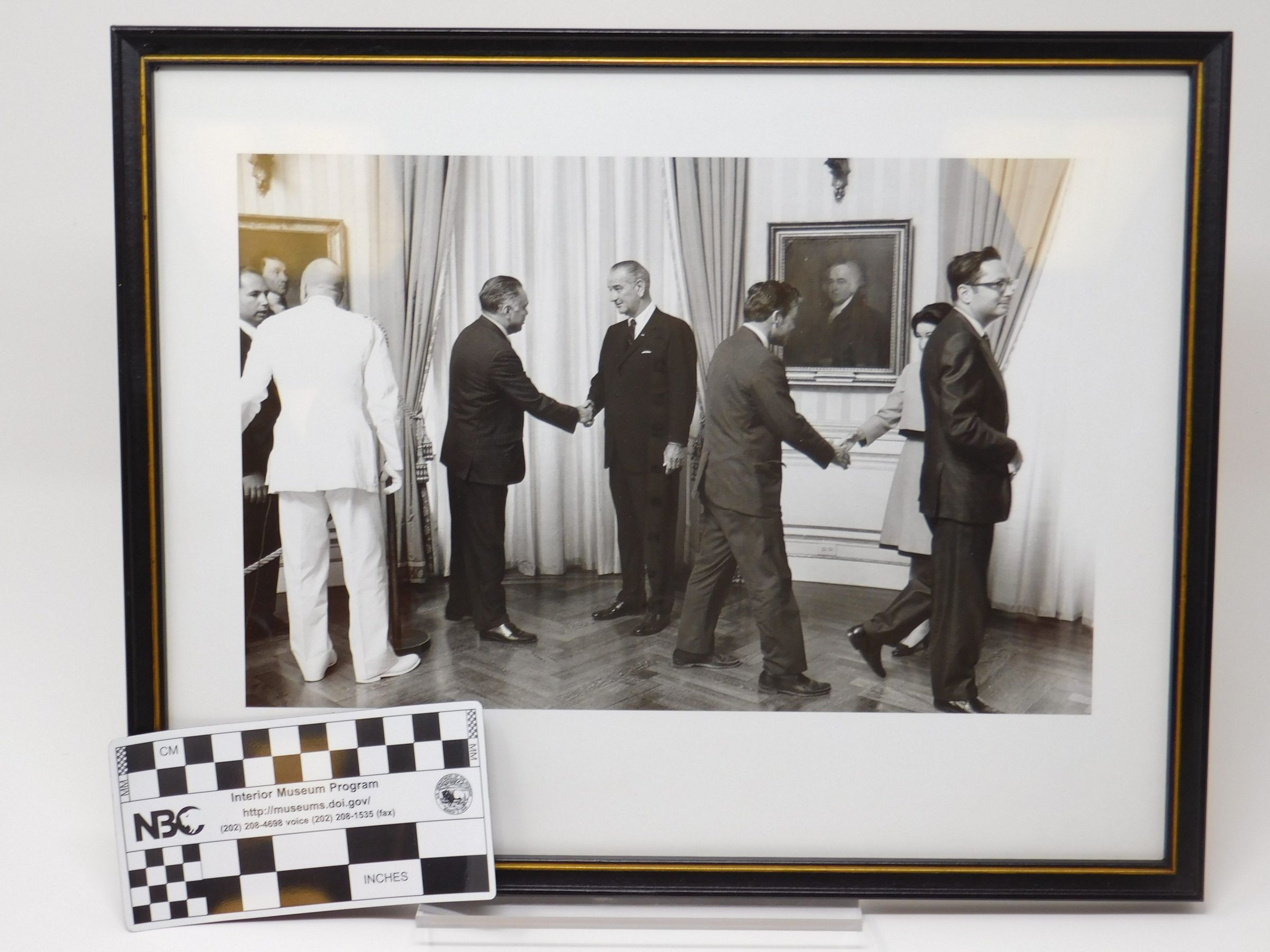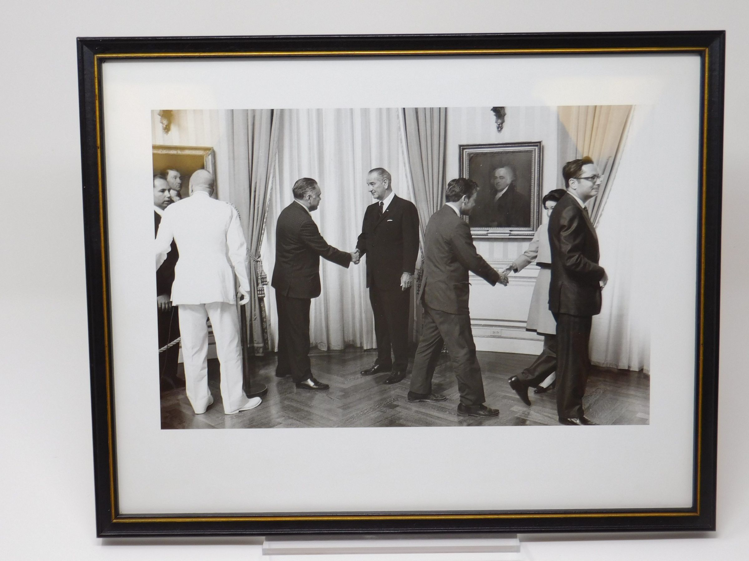 Framed black and white photo of Robert Bennett shaking hands with President Lyndon Johnson. Five other individuals are also in the photo which seems to have been taken in a round room.Photograph Details