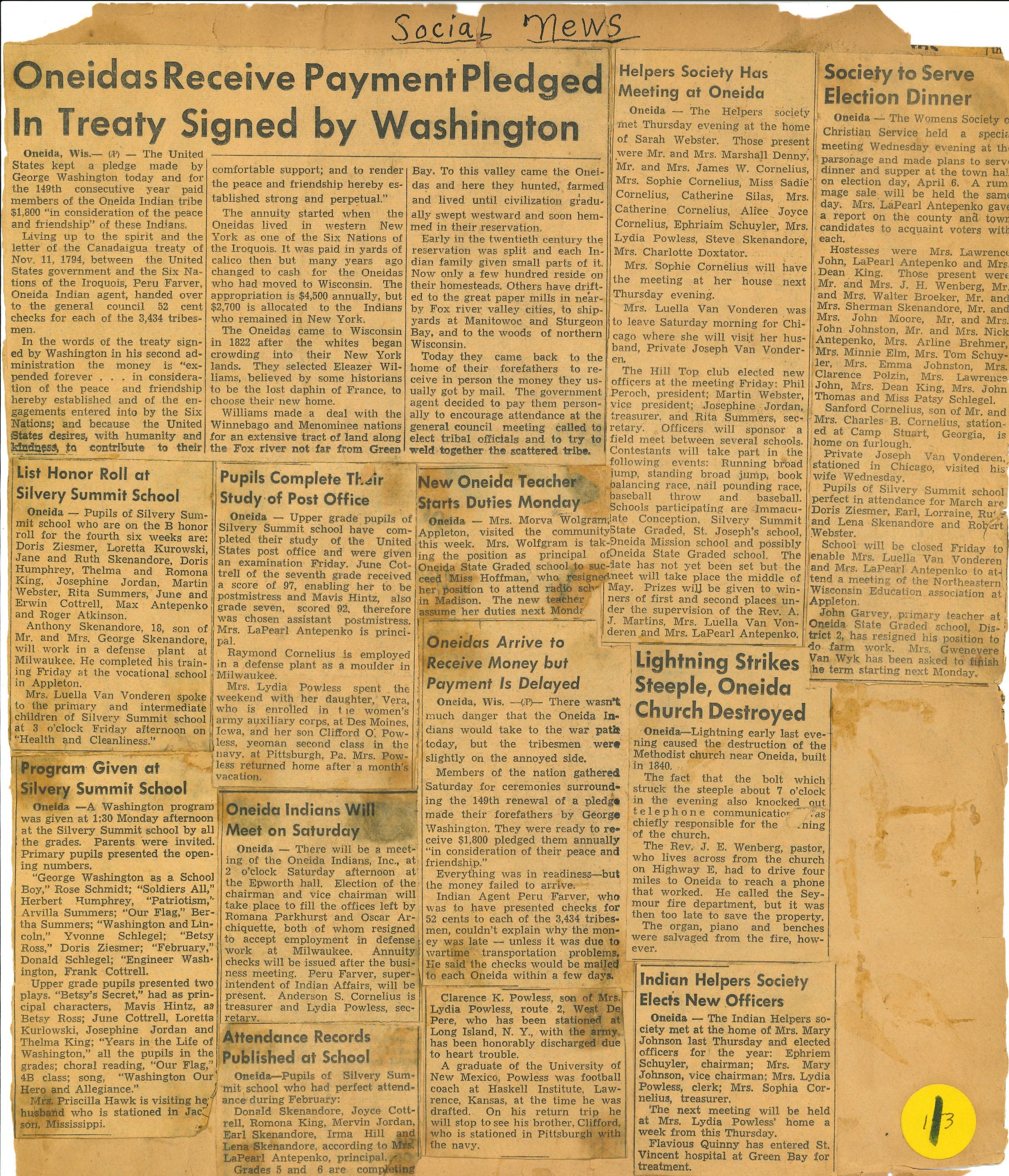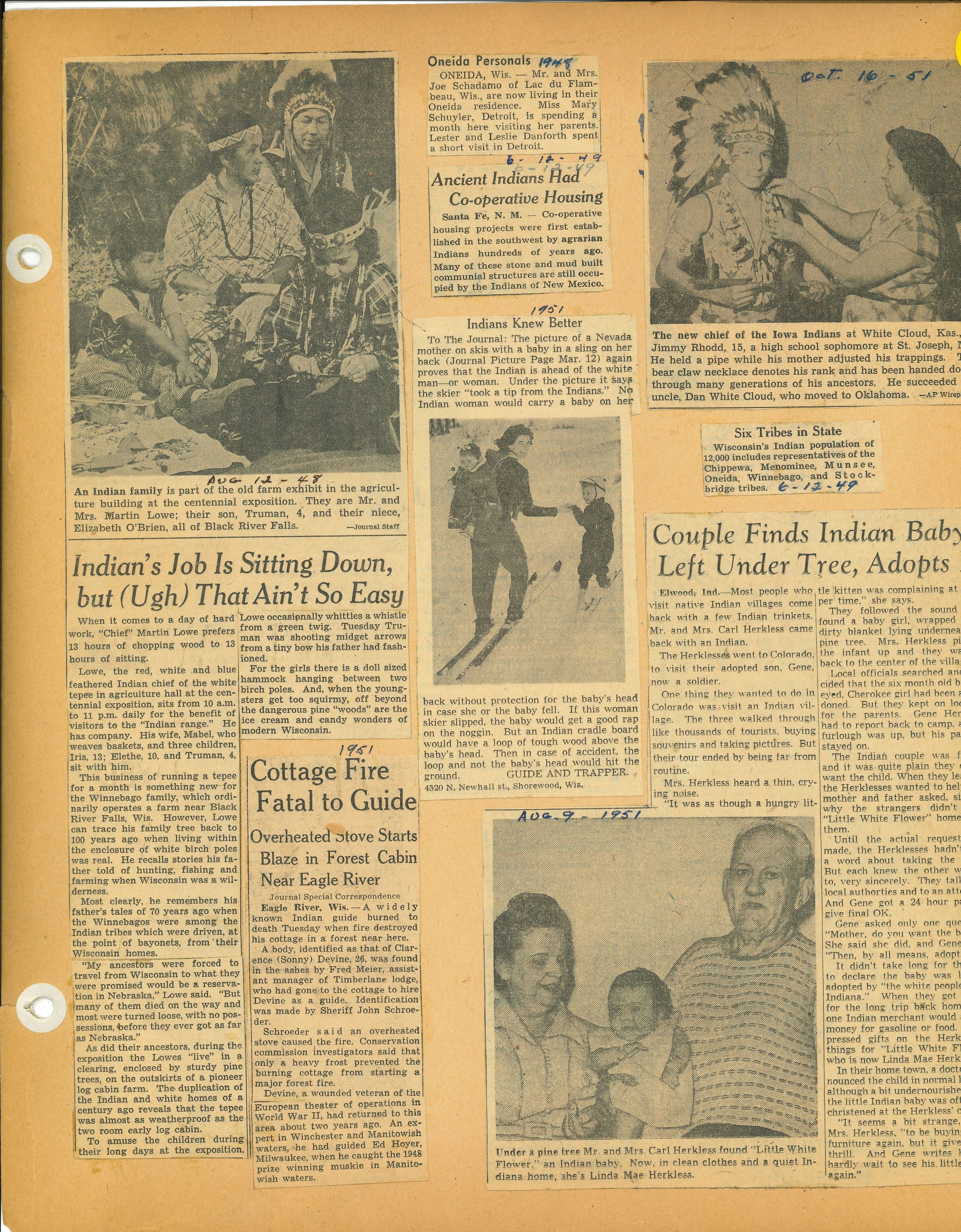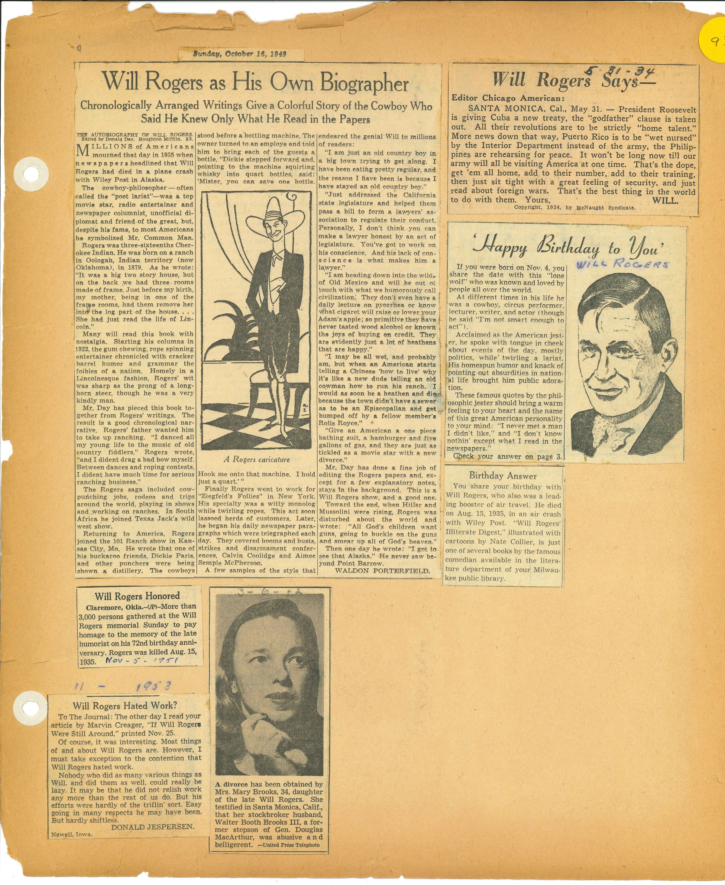 Pages of newspaper clippings glued to an old scrapbook that no longer has a cover.Collection