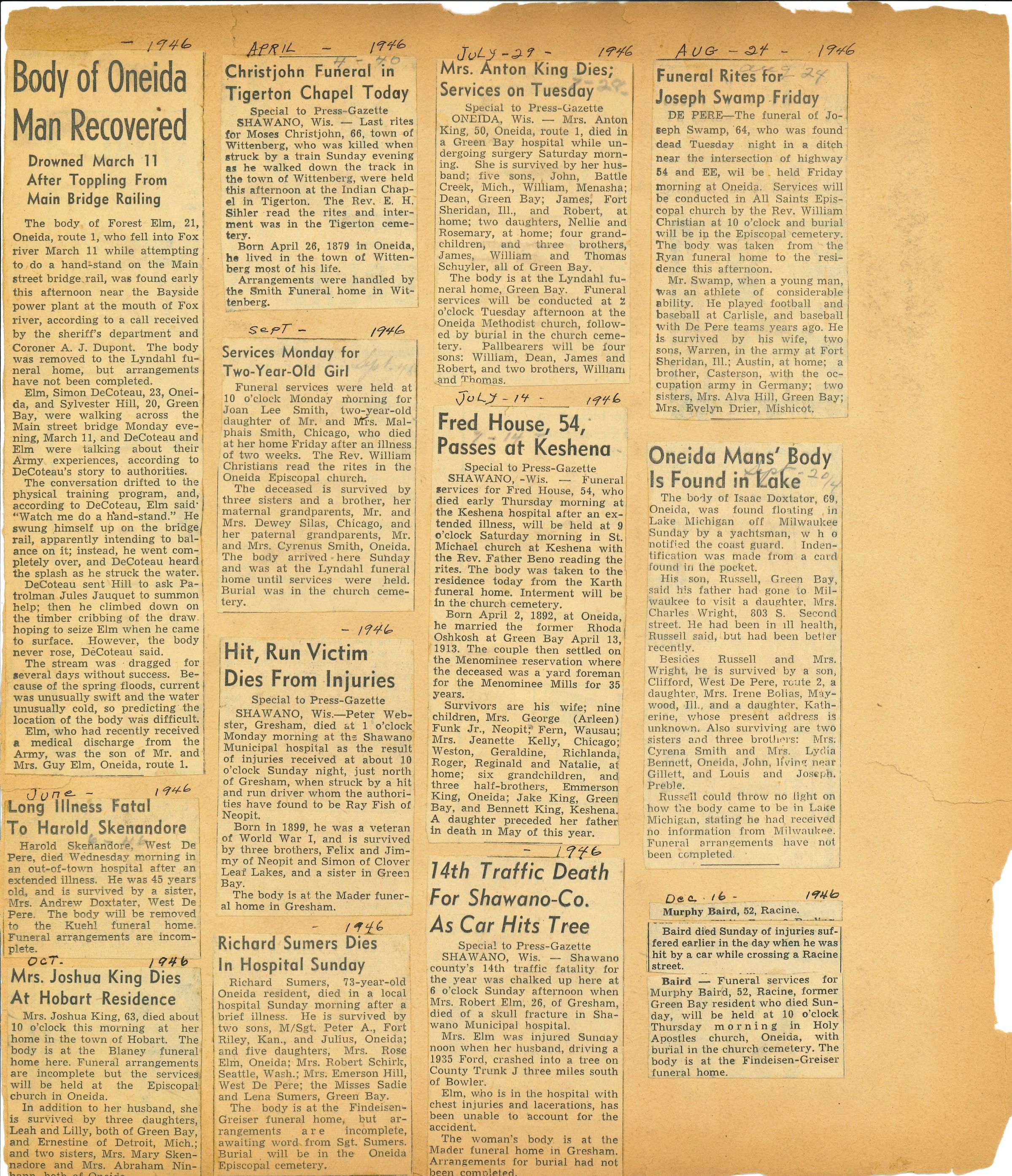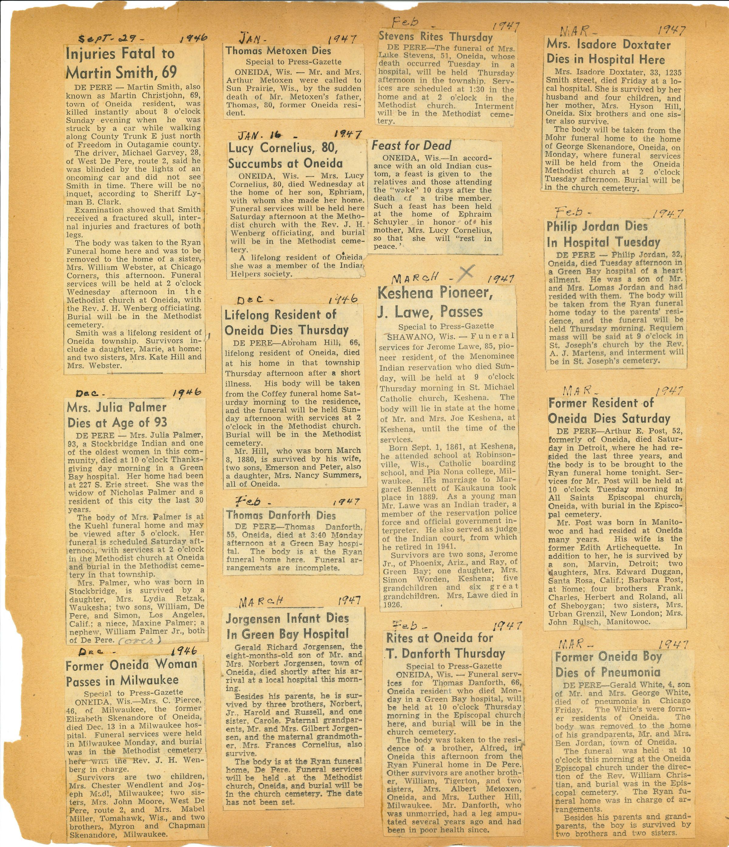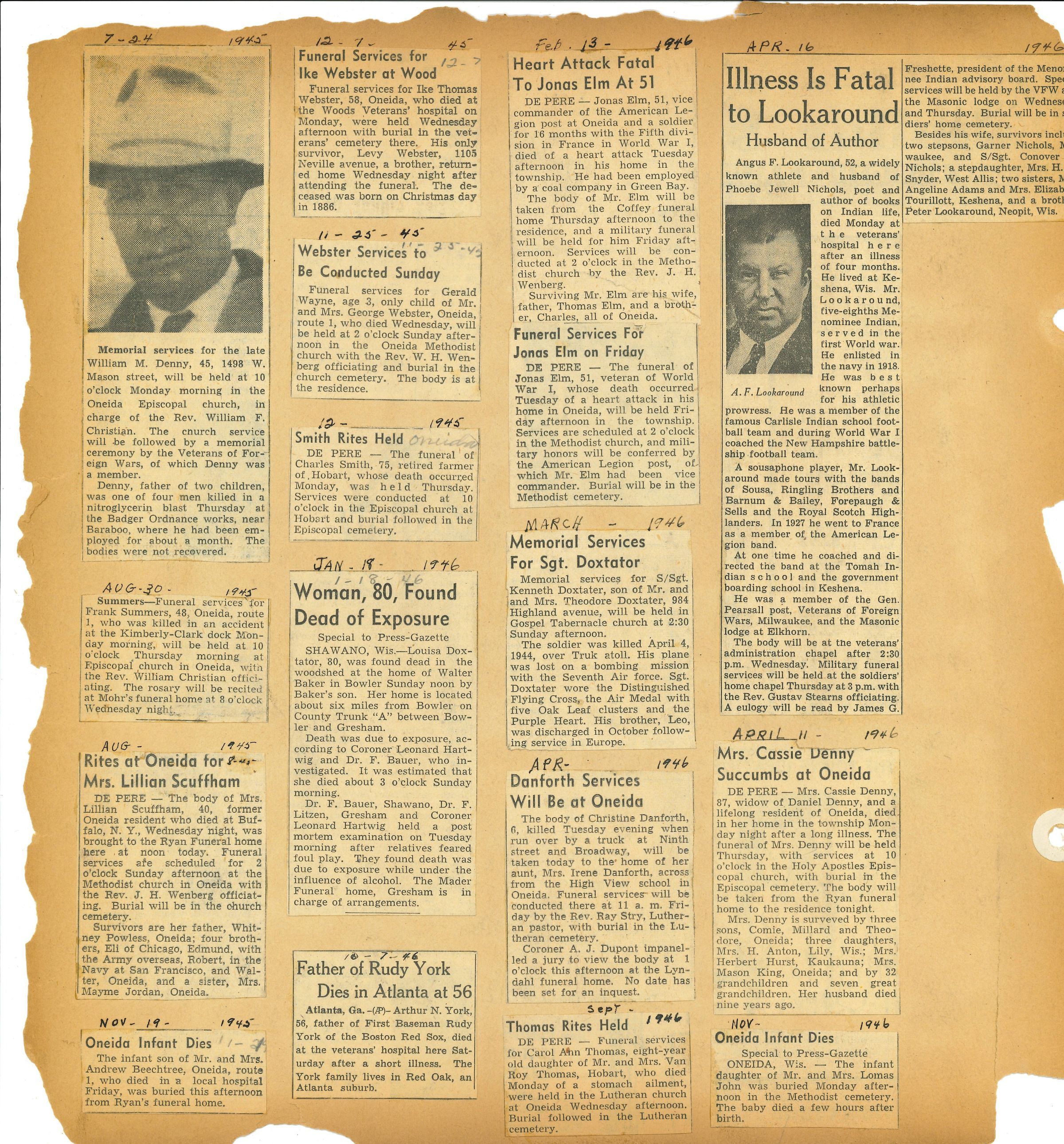 Pages of newspaper clippings glued to an old scrapbook that no longer has a cover.Collection