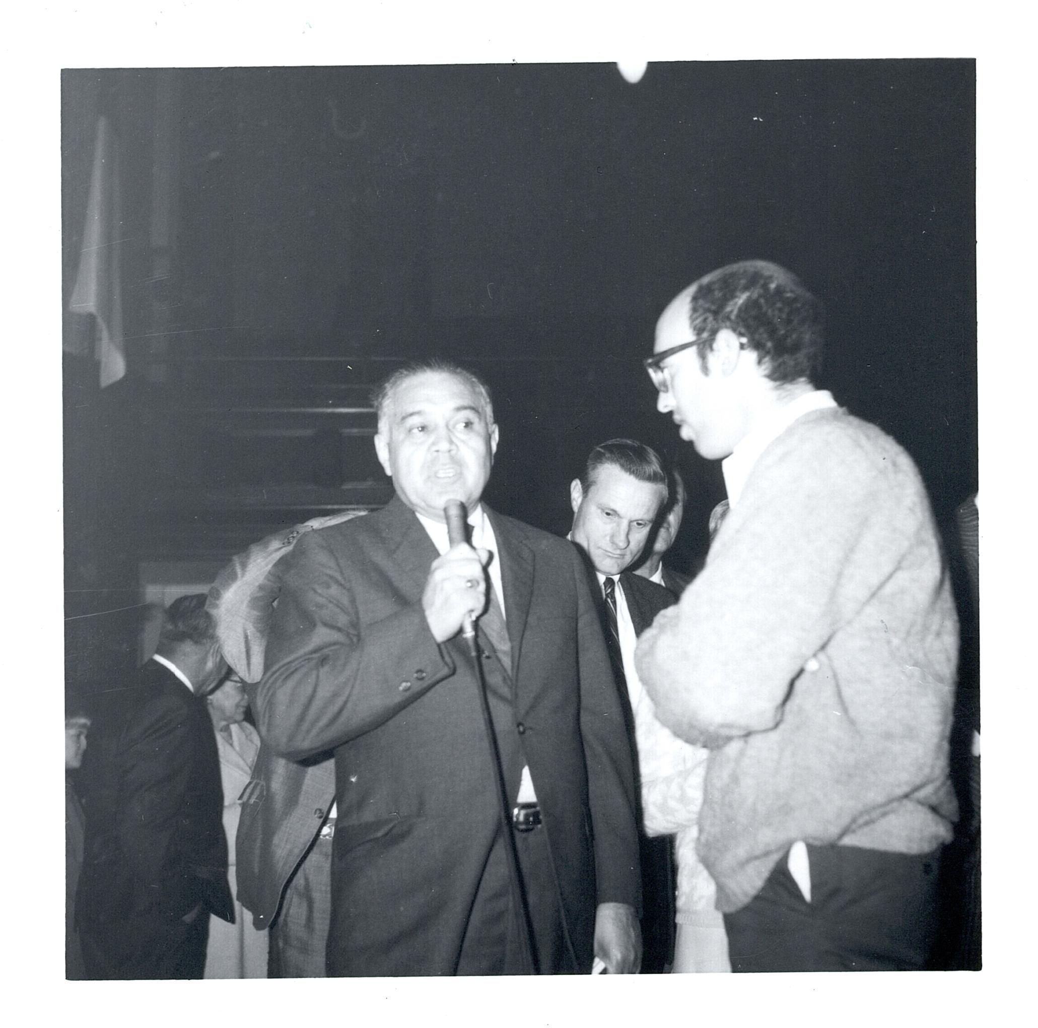 Black and white photograph of Robert Bennett speaking into a microphone with a man wearing glasses and arms crossed directly in front of him. There are other people in the background.Collection