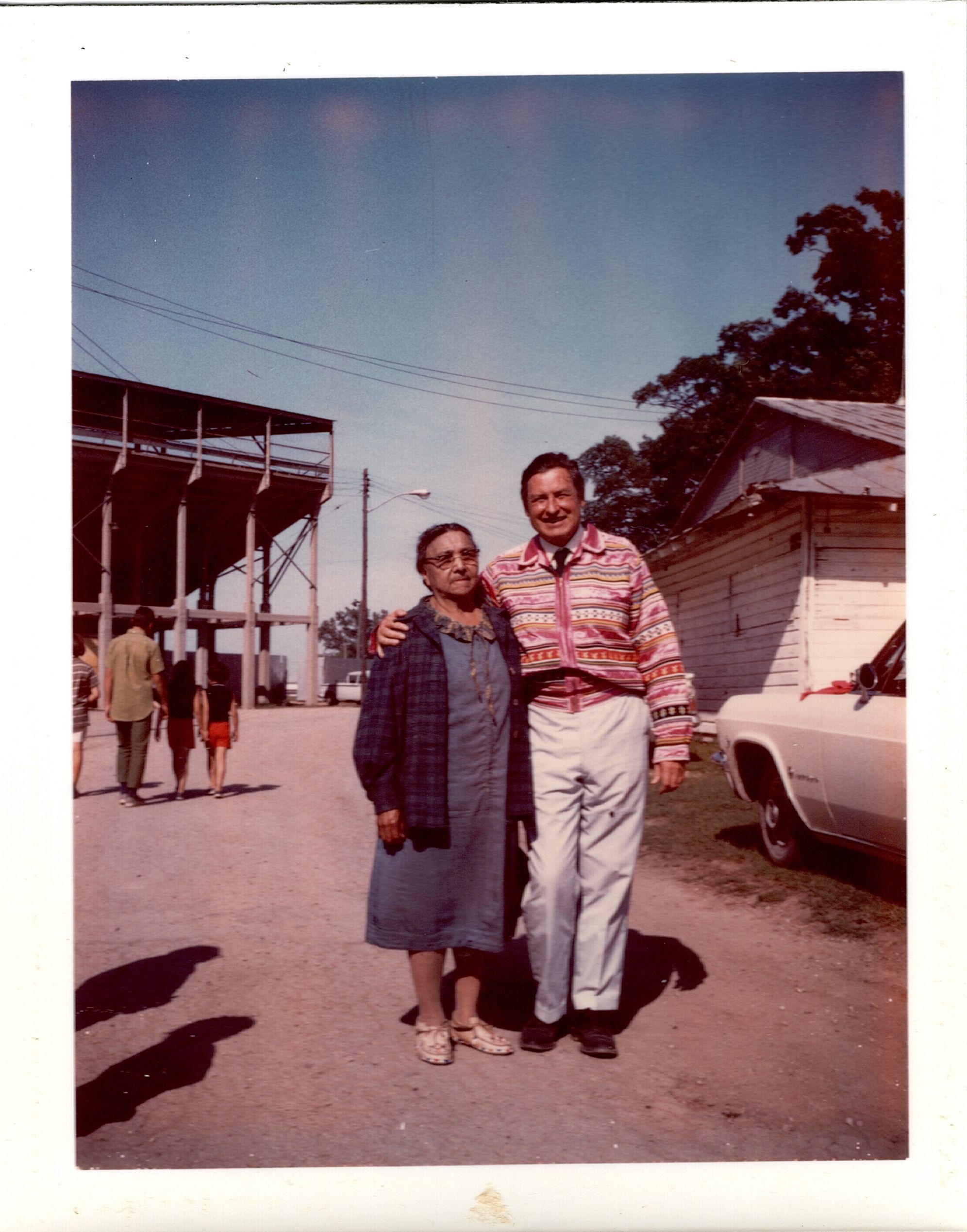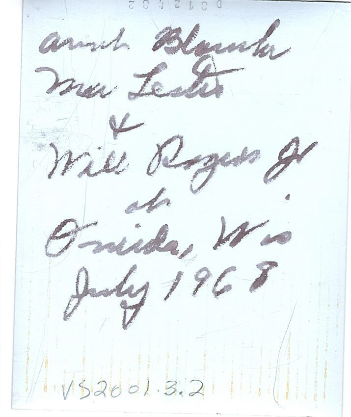 Colored photo of a woman in a blue dress with a checkered jacket standing next to a man in khaki pants and a striped, patterned jacket with his arm around her. There are bleachers in the background and a white building to their left, along with a white car to their left. The back of the photo reads "Aunt Blanche McLester and Will Rogers, Jr. at Oneida, Wis., July 1968" in a black thick ink.Photograph Details