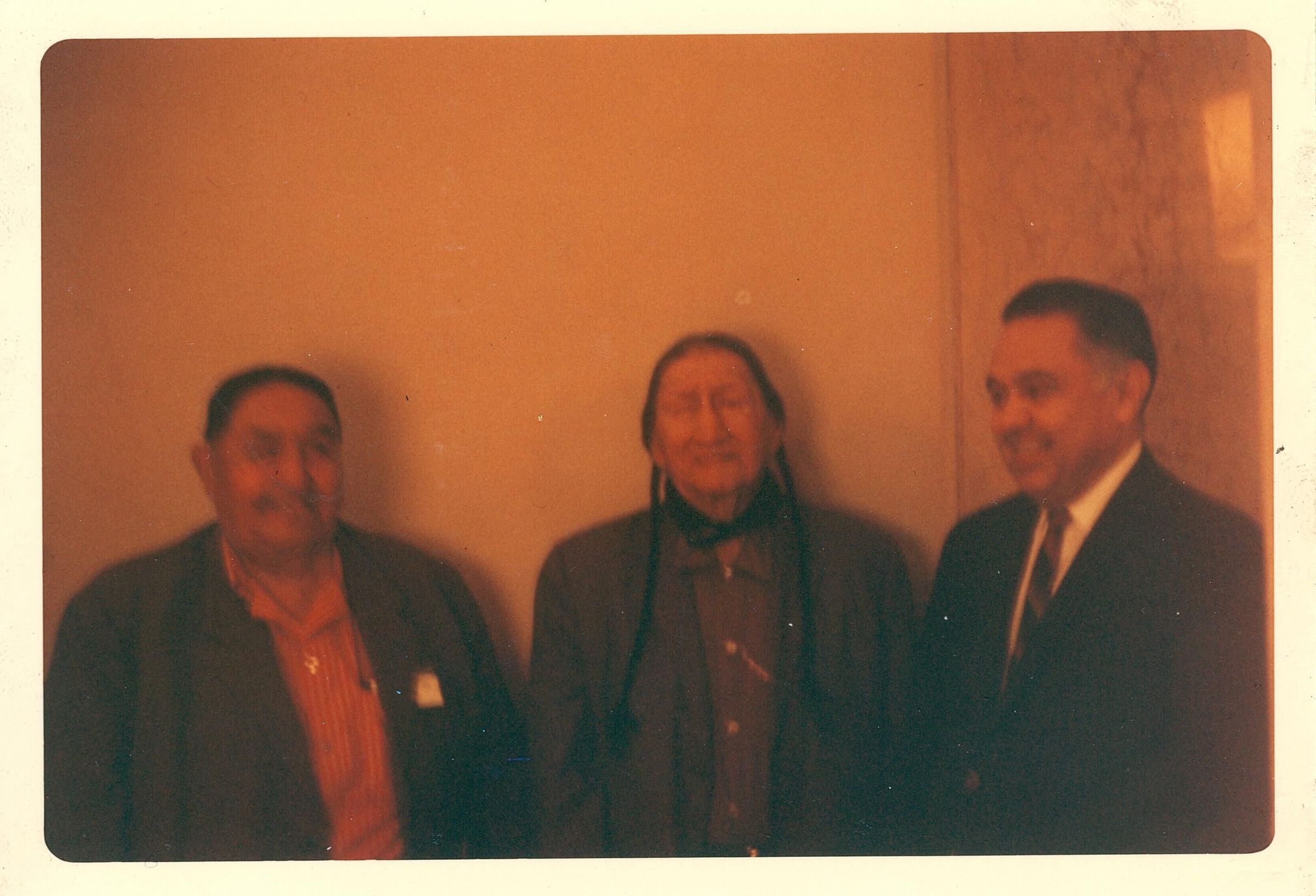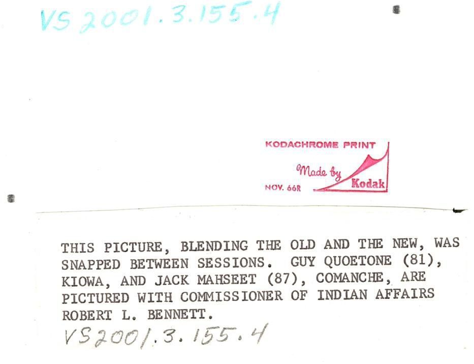 Colored photo of three men standing shoulder to shoulder. Man on the left is wearing a red button up shirt and jacket; man in the middle is wearing a button up shirt and jacket with two braids; man on the right is Robert Bennett wearing a suit and tie. The back reads "This picture, blending the old and the new, was snapped between sessions. Guy Quoetone (81), Kiowa, and Jack Mahseet (87), Comanche, are pictured with Commissioner of Indian Affairs Robert L. Bennett."Photograph Details