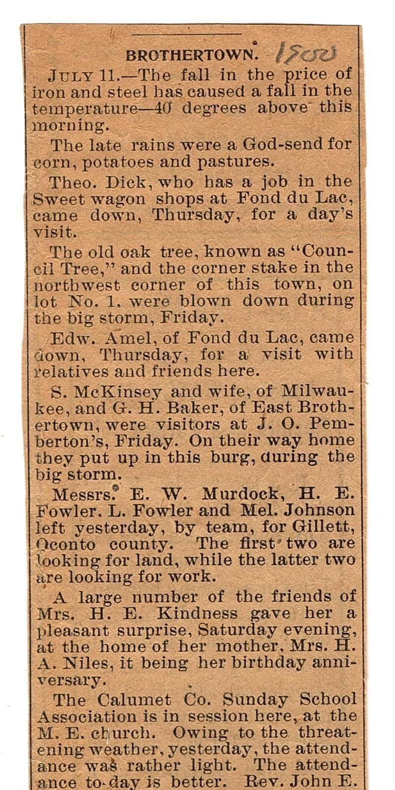 Long thin clipping from a newspaper with "1900" written in pencil at the top. The article begins "Brothertown. July 11--The fall in the price of iron and steel has caused a fall in the temperature--40 degrees above this morning." The rest reads like a weather report as well.Collection