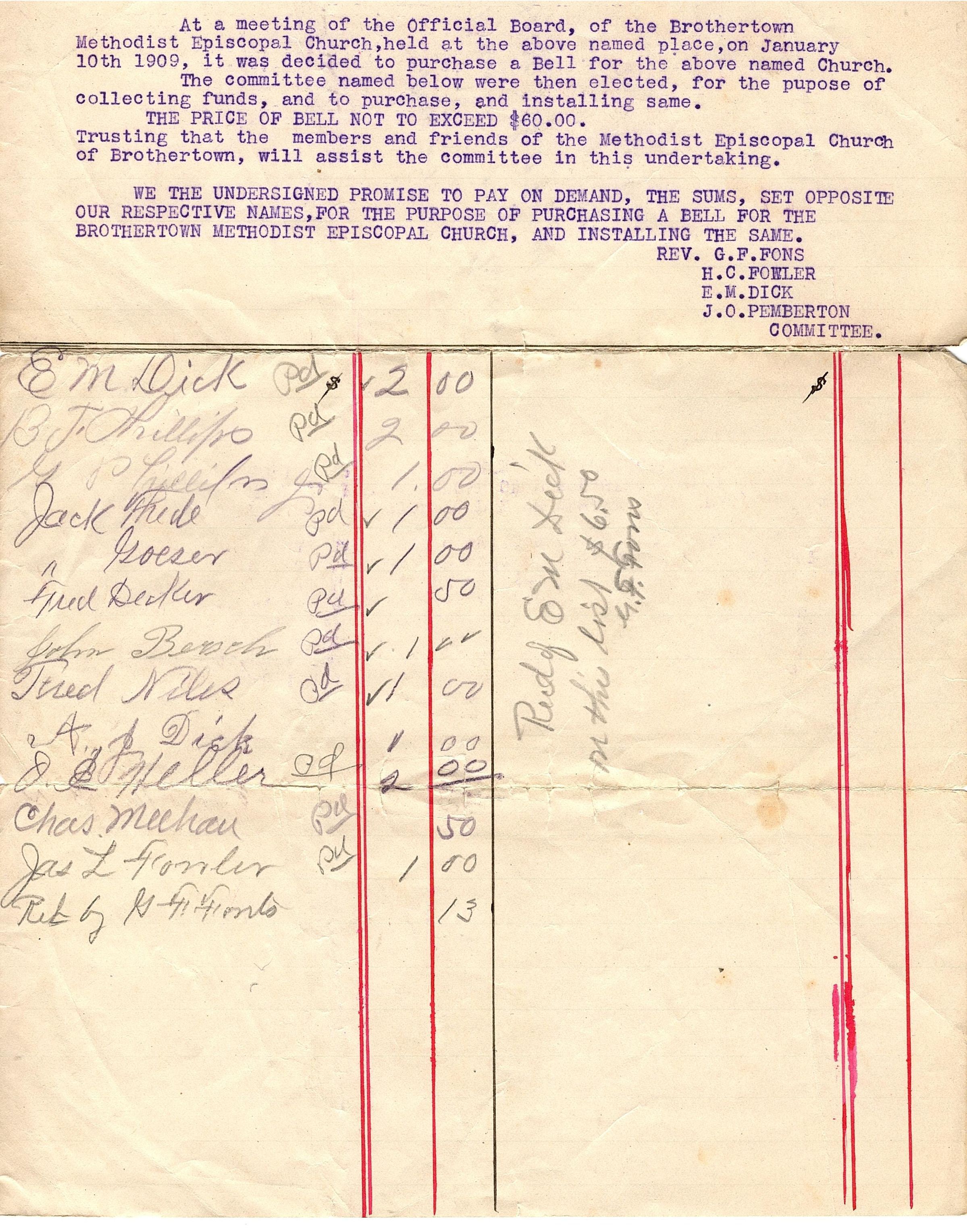 Single sheet of paper with blue printed description at the top and a grid in red and black ink at the bottom with six columns. The columns are filled out in pencil and include names, prices, and whether "pd" (paid) or not. The blue printed portion describes the vote to purchase a new bell for the Brothertown Methodist Episcopal Church not to exceed $60.00. The list is a commitment to pay what they promised towards the bell purchase. Signed (by print) by Rev. G.F. Fons, H.C. Fowler, E.M. Dick, J.O. Pemberton. Written in black ink on the back is "May 27-9, Received of HC Fowler, $1.00 Bill Money".Collection